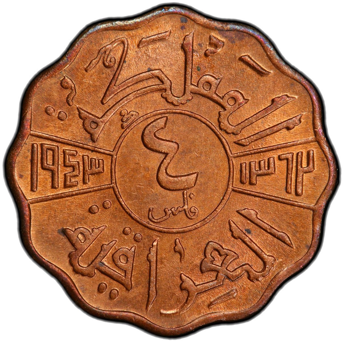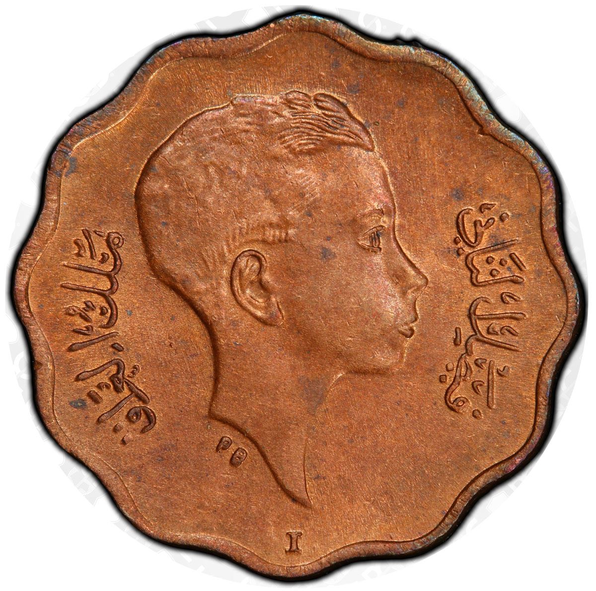 IRAQ: Faisal II, 1939-1958, AE 4 fils, 1943/AH1362, KM-107, struck at the Bombay mint, PCGS graded MS64 RB, ex Don Erickson Collection.