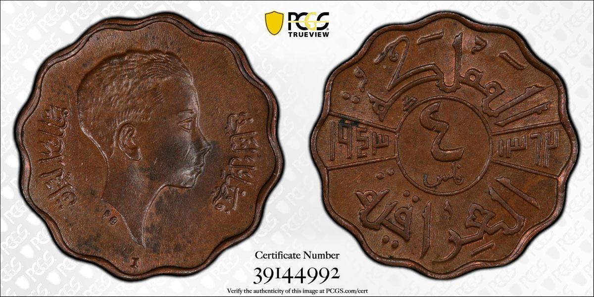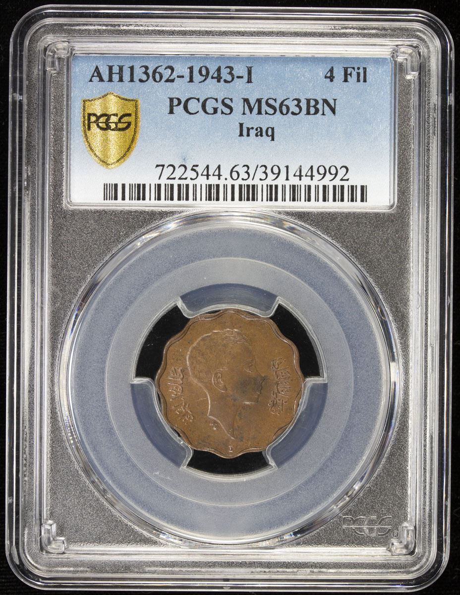 IRAQ: Faisal II, 1939-1958, AE 4 fils, 1943-I/AH1362, KM-107, one-year type, PCGS graded MS63 BN.