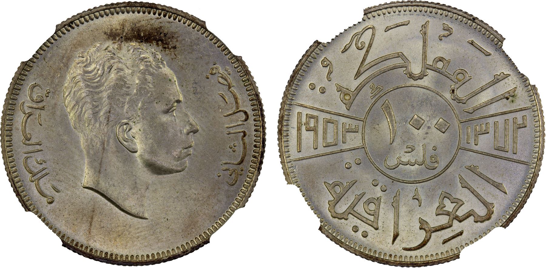 IRAQ: Faisal II, 1939-1958, AR 100 fils, 1953/AH1372, KM-114, a superb example for this rare date, tied for top pop at both NGC and PCGS, NGC graded MS65.