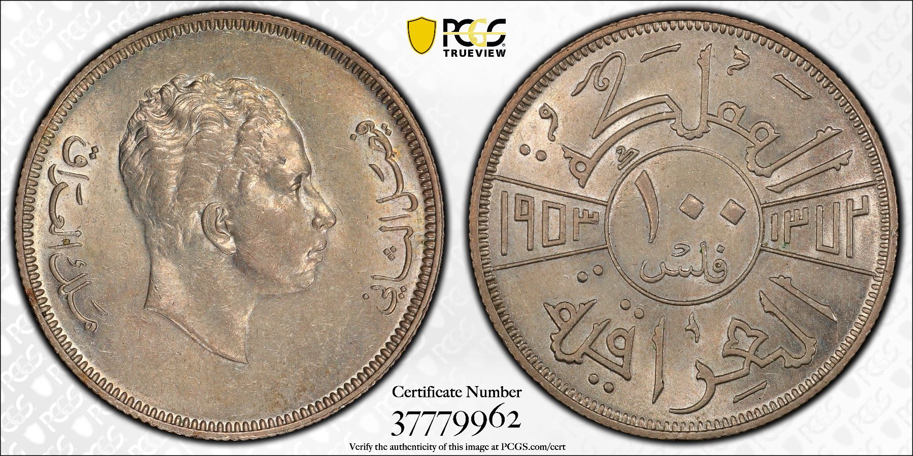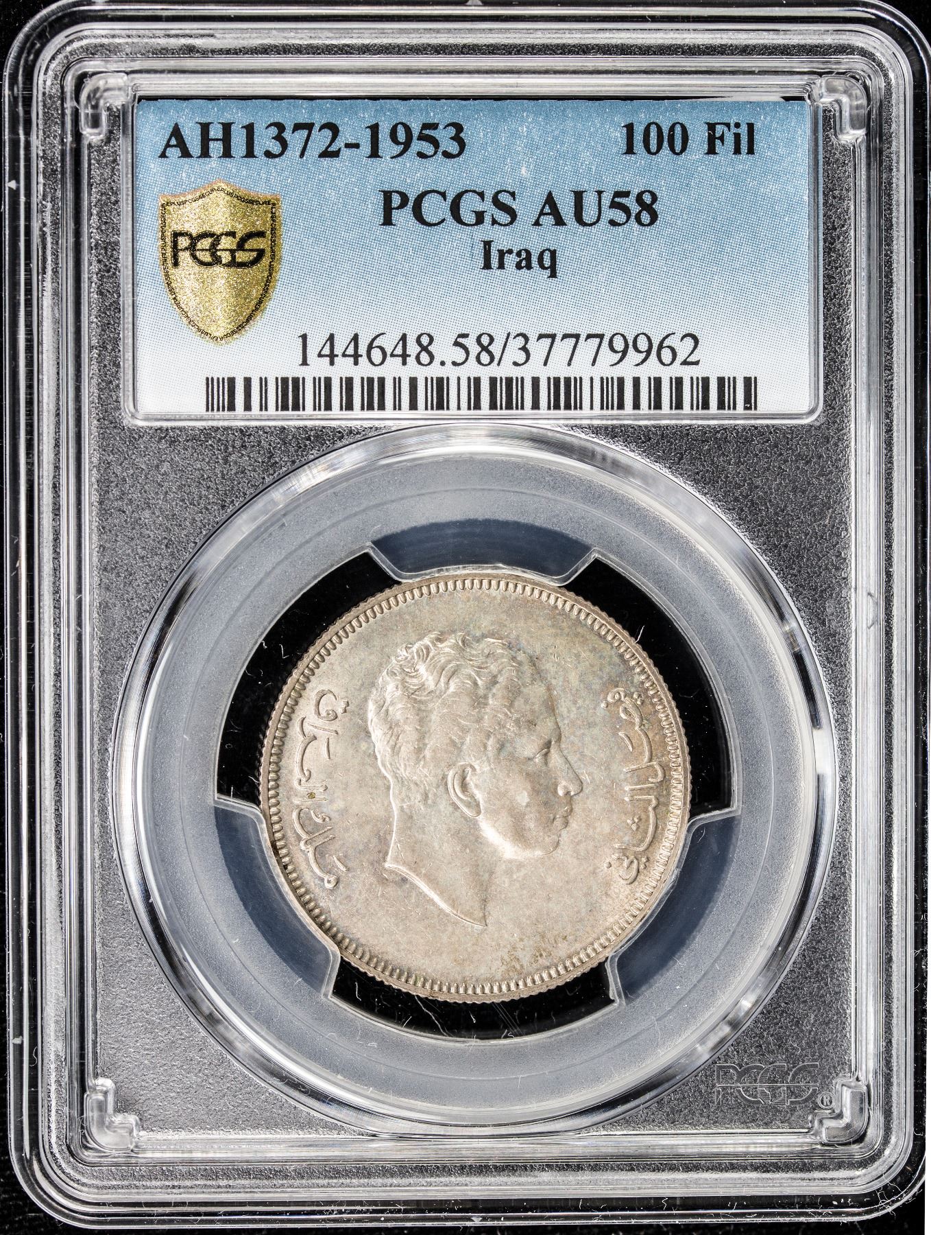 IRAQ: Faisal II, 1939-1958, AR 100 fils, 1953/AH1372, KM-115, PCGS graded AU58.