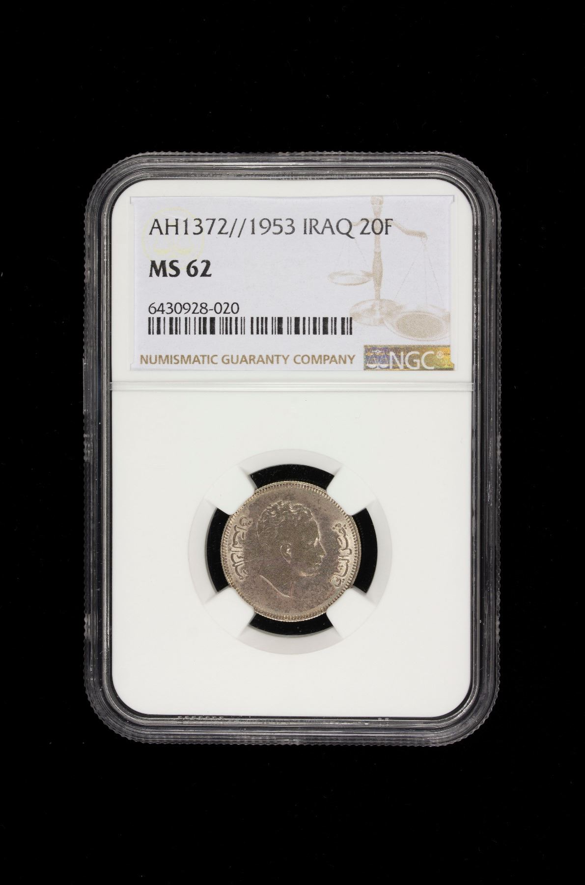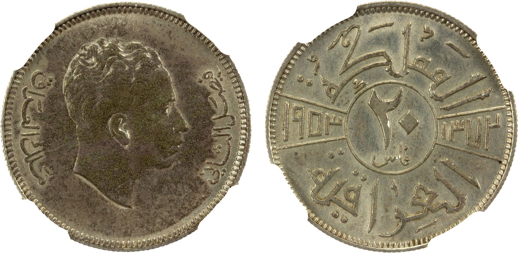 IRAQ: Faisal II, 1939-1958, AR 20 fils, 1953/AH1372, KM-113, NGC graded MS62.
