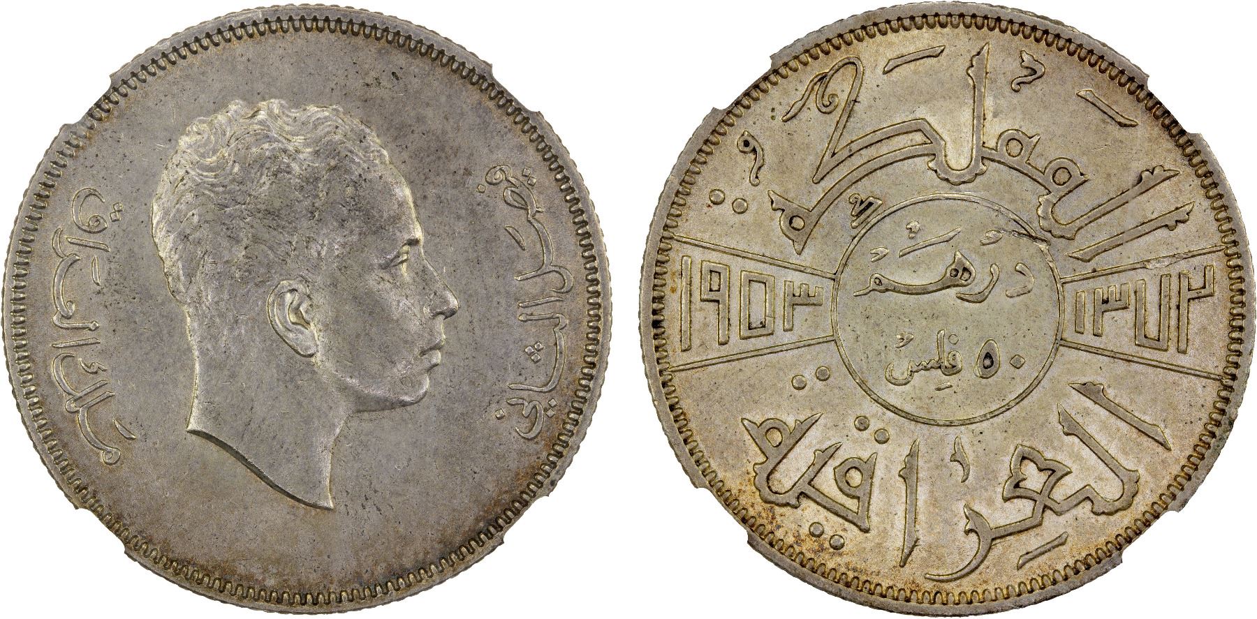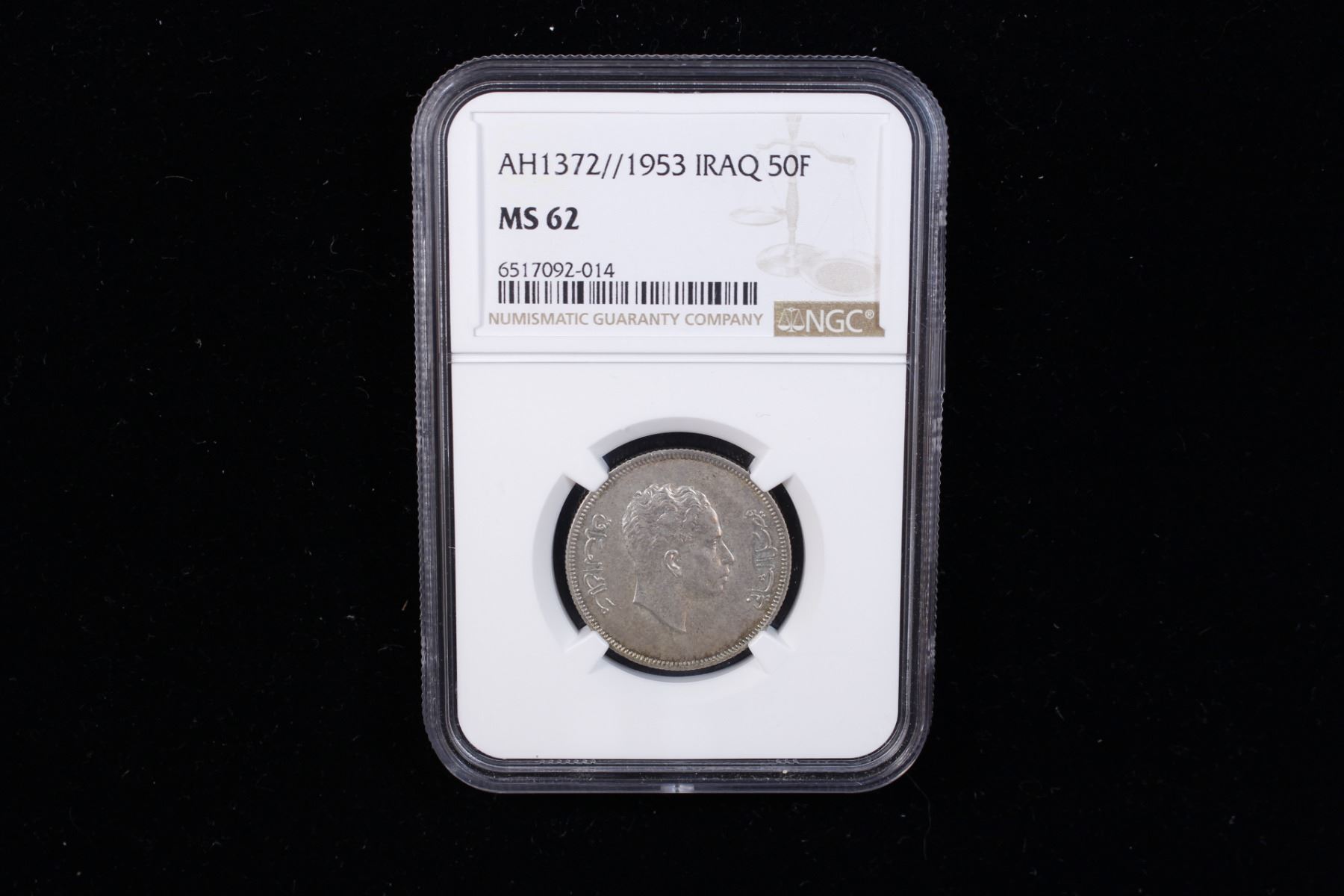 IRAQ: Faisal II, 1939-1958, AR 50 fils, 1953/AH1372, KM-114, rare date, attractive light luster, NGC graded MS62.