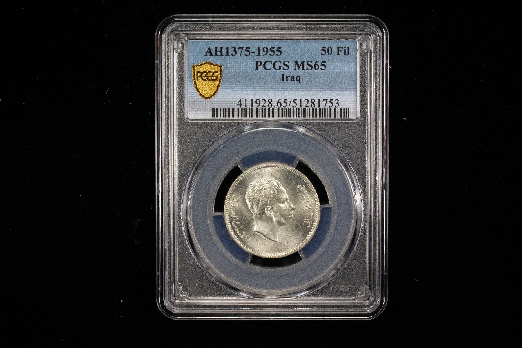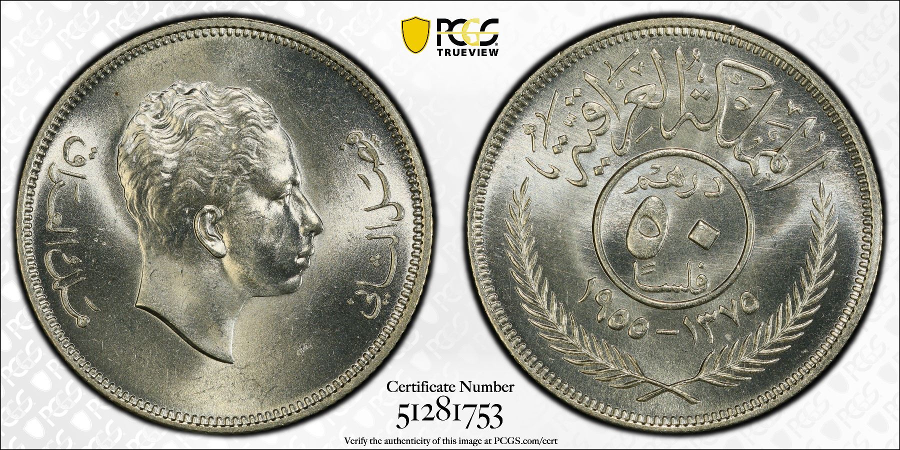IRAQ: Faisal II, 1939-1958, AR dirham (50 fils), 1955/AH1375, PCGS MS65