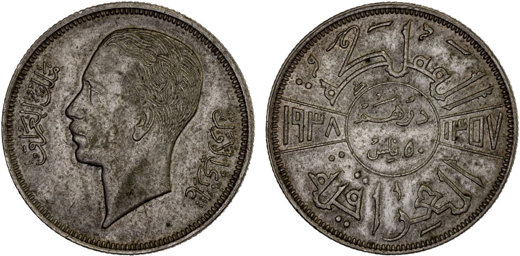 IRAQ: Ghazi I, 1933-1939, AR 50 fils, 1938/AH1357, Choice XF