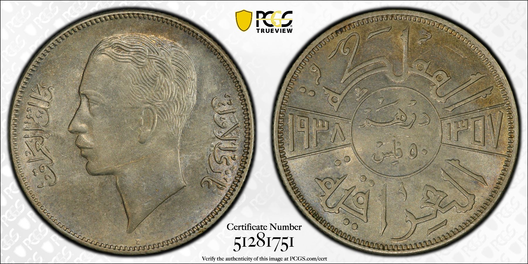 IRAQ: Ghazi I, 1933-1939, AR 50 fils, 1938/AH1357, PCGS MS62