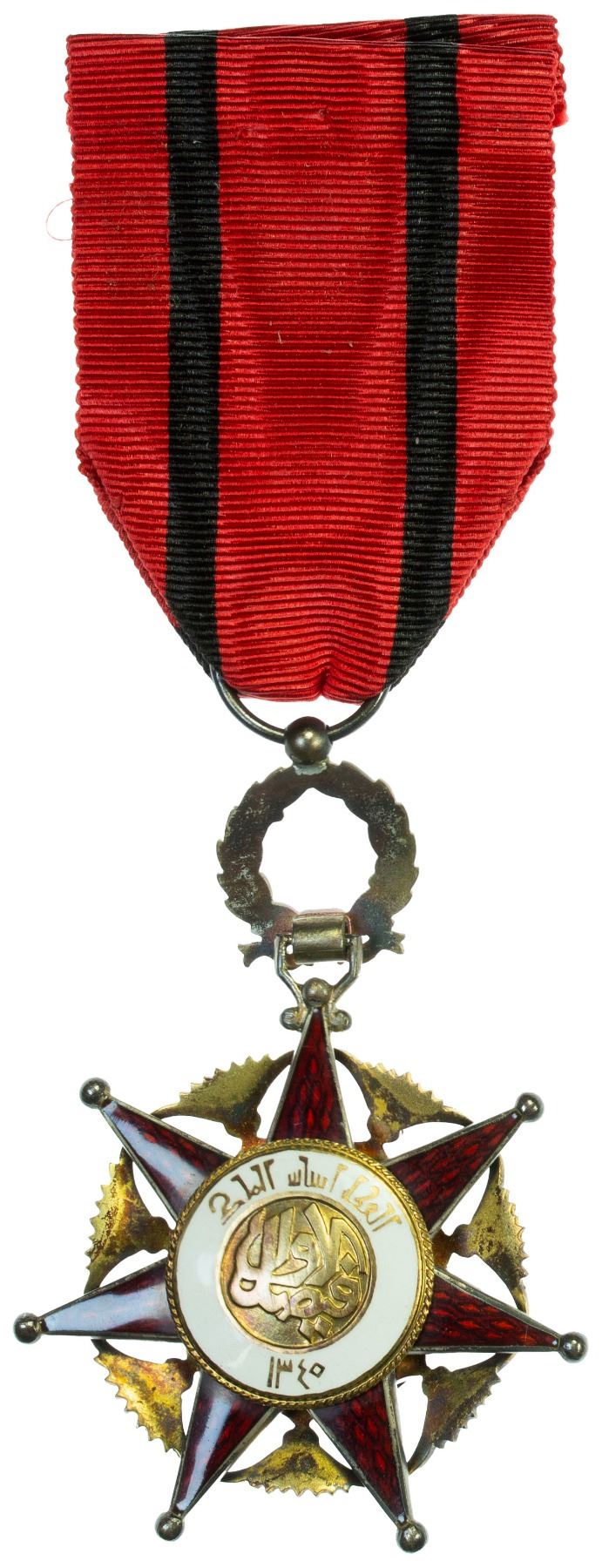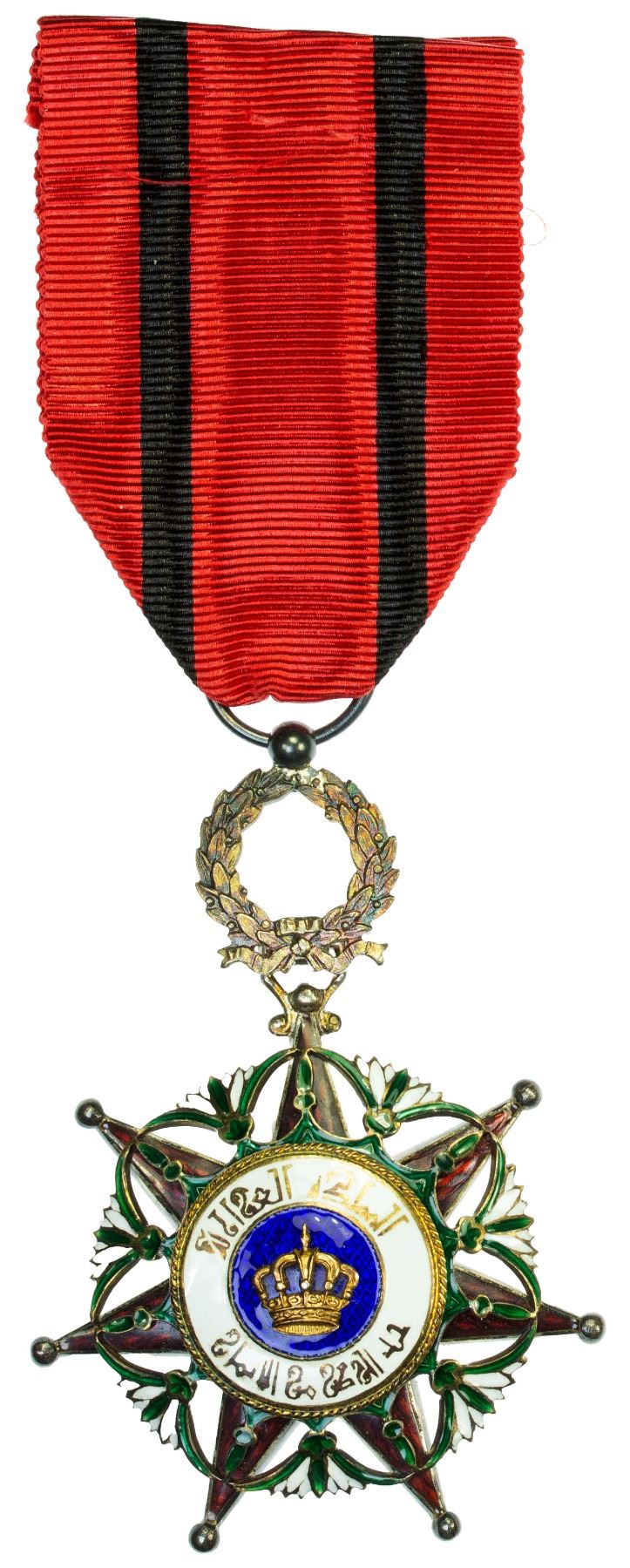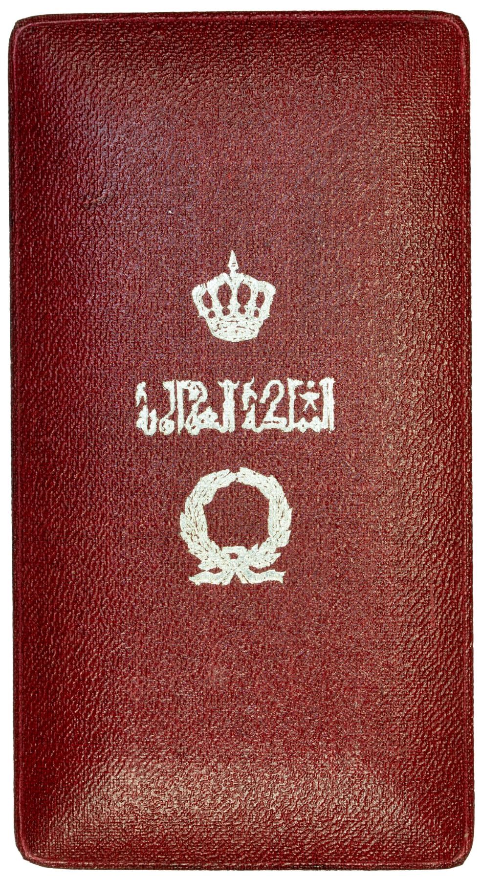 IRAQ: Kingdom, AE order, Order of the Two Rivers (Wisam al-Rafidain), Knight (Faris) class, with ribbon of the civil division, with original British Garrard Company Ltd., London case of issue, XF, ex Joseph E. Lang Collection. The Order of the Two Rivers was an Order that was instituted by King Faisal I of the Hashemite Kingdom of Iraq. It was named after the two rivers, the Euphrates and Tigris, that flow through the middle of the country. It was initially awarded by the kings of Iraq between 1922 when the monarchy was established, and 1958 when the monarchy ended. It had five classes and two divisions (military and civil). It is nscribed al-mamlikat al-'iraqiya at top obverse ("Kingdom of Iraq") and hubb al-watan min al-aymân ("patriotism from trust") below on obverse, and is gilt and enameled. "Hubb al-watan" literally means "love of the country," i.e., "patriotism." With date AH1340 on reverse.