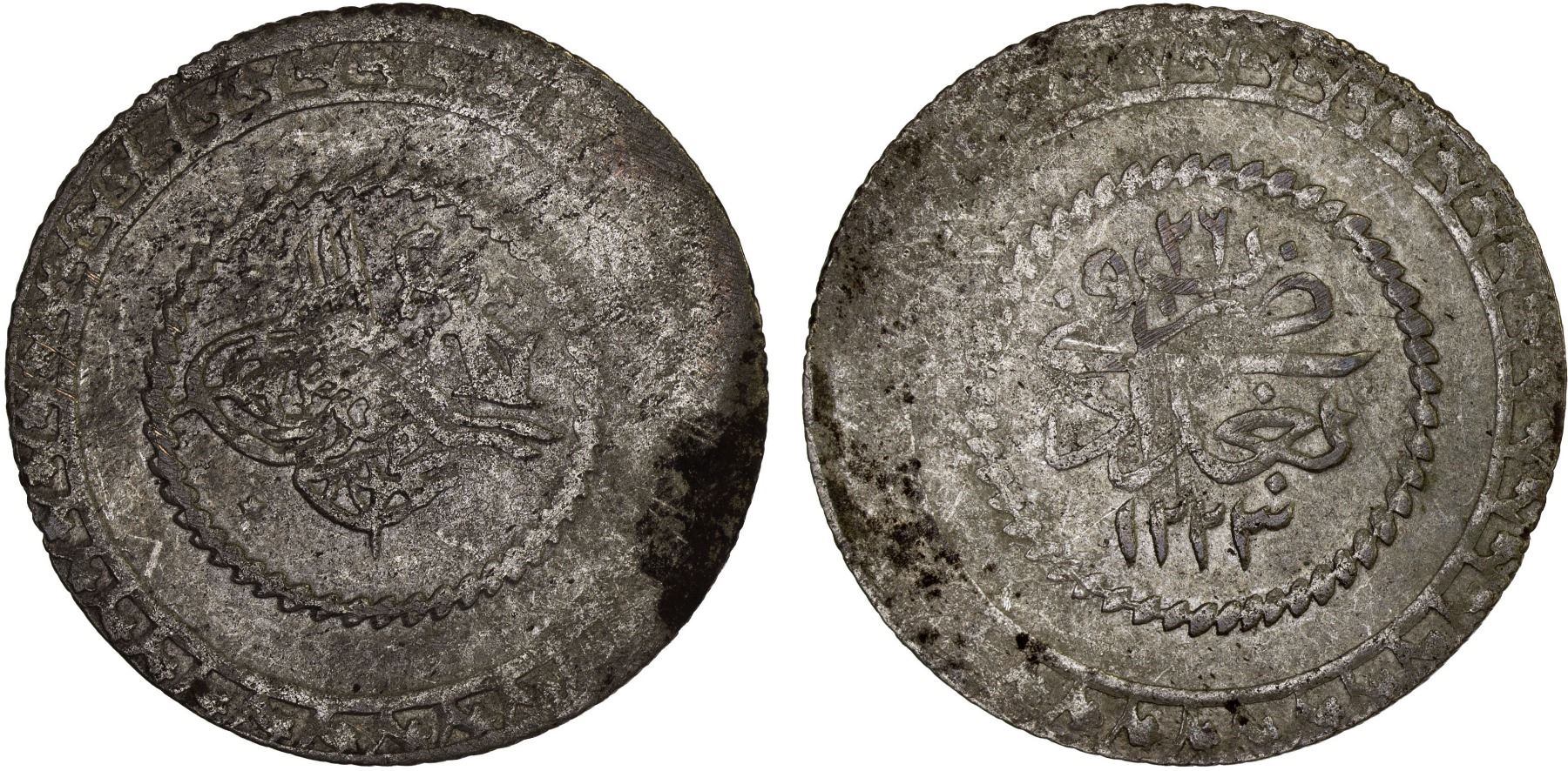 IRAQ: Mahmud II, 1808-1839, BI 5 piastres (6.94g), Baghdad, AH1223 year 26, KM-78, some weakness, but actually little wear, VF-XF, ex Kenneth A. Bovenkamp Collection.