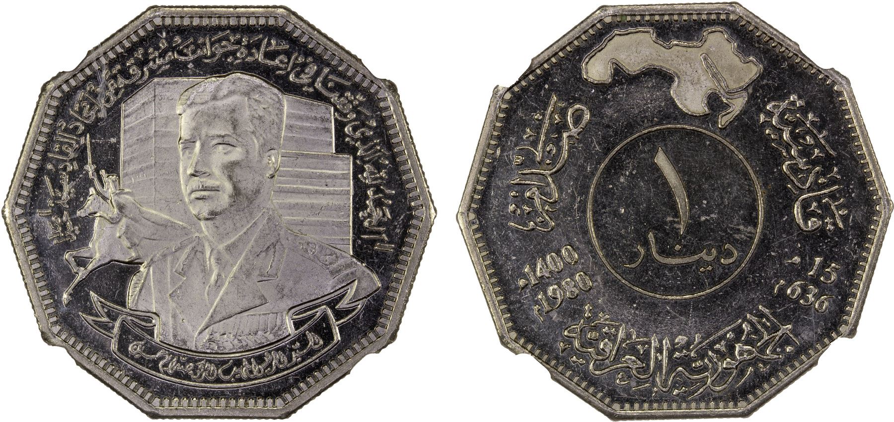 IRAQ: Republic, 1 dinar, 1980/AH1400, KM-149, Battle of al-Qadisiyyah, bust of Saddam Hussein, NGC graded PF63 Ultra Cameo. The Battle of al-Qadisiyyah, fought in 636 AD, was a decisive battle between the Arab Muslim army and the army of the Sasanian Empire of Persia during the first period of Muslim conquests. The timing of this issue is purposeful as it took place at the onset of the Iran-Iraq War (1980-1988).