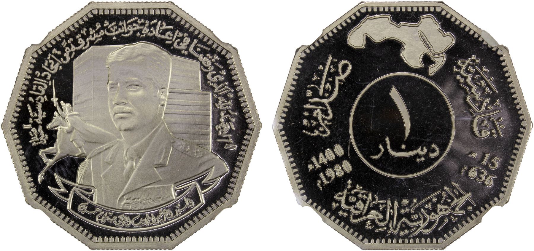 IRAQ: Republic, 1 dinar, 1980/AH1400, KM-149, Battle of Qadissyiat, 10-sided, NGC graded Proof 69 Ultra Cameo.