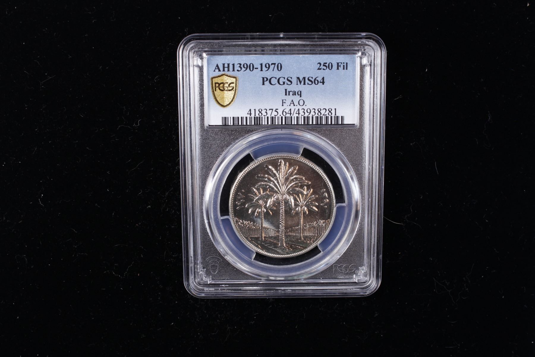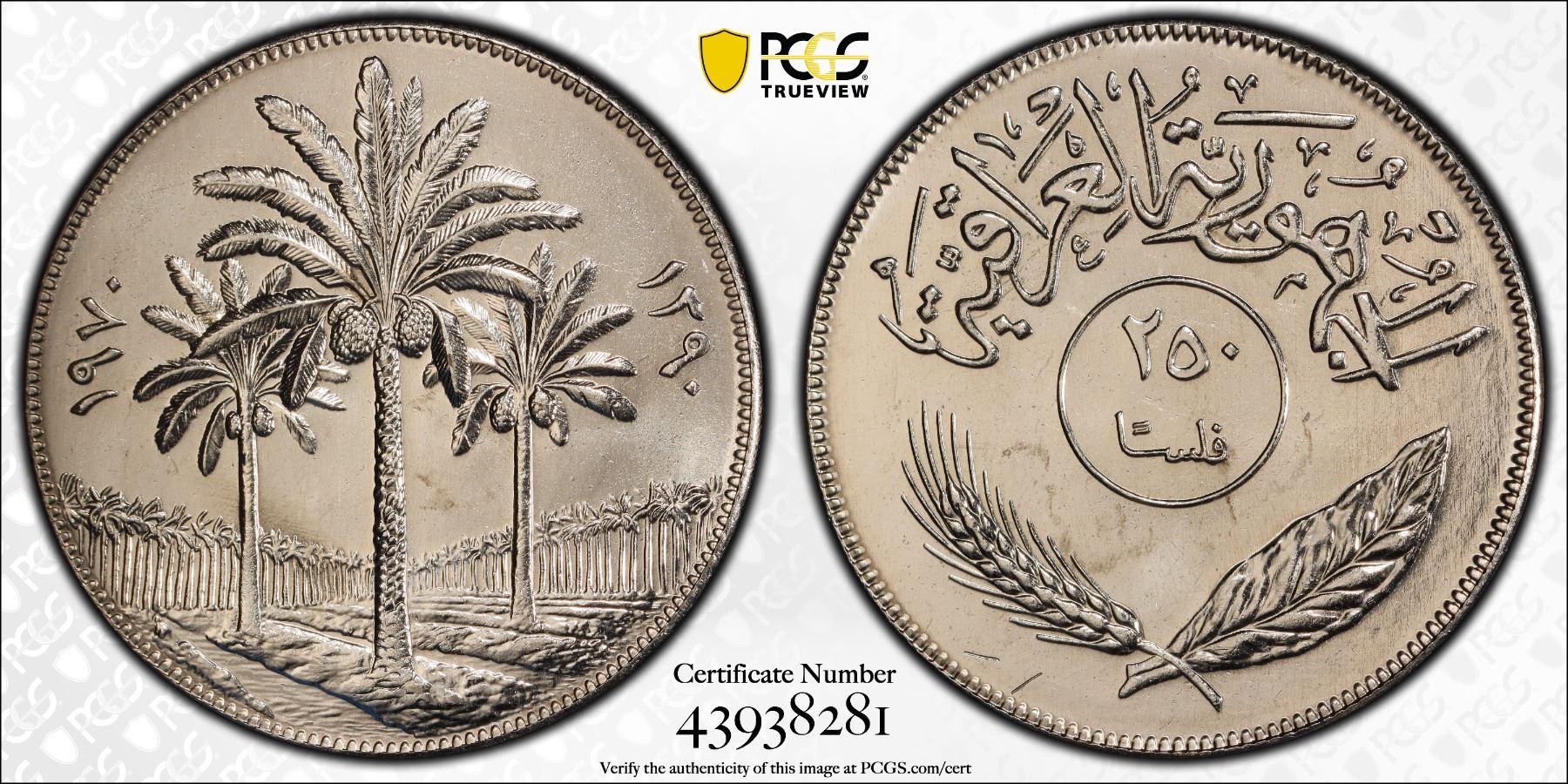 IRAQ: Republic, 250 fils, 1970/AH1390, KM-130, F.A.O. Agrarian Reform Day, variety with edge inscription, very lustrous, PCGS graded MS64.