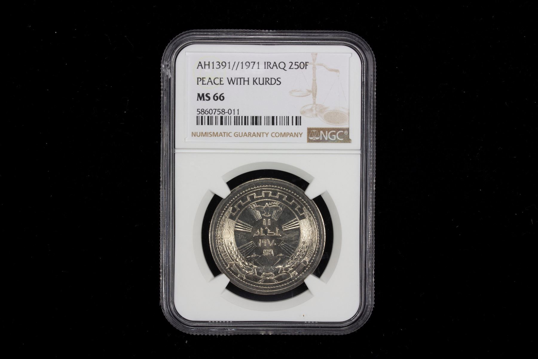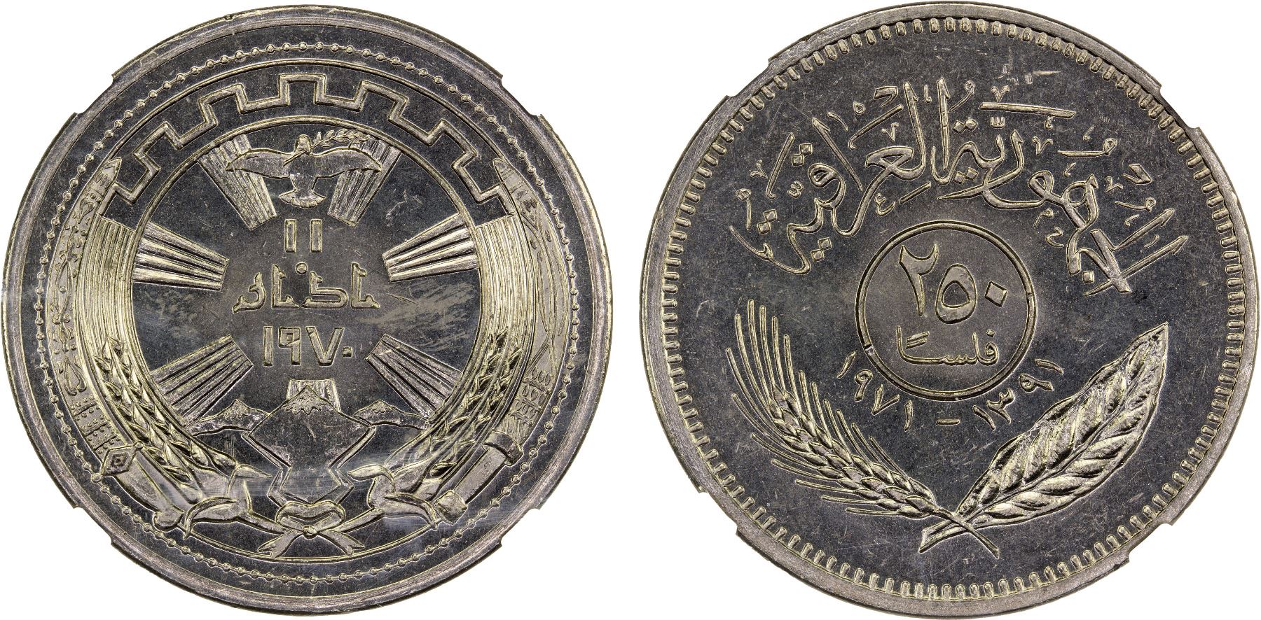 IRAQ: Republic, 250 fils, 1971/AH1391, KM-131, First Anniversary of Peace with Kurds, beautiful cartwheel luster, NGC graded MS66.