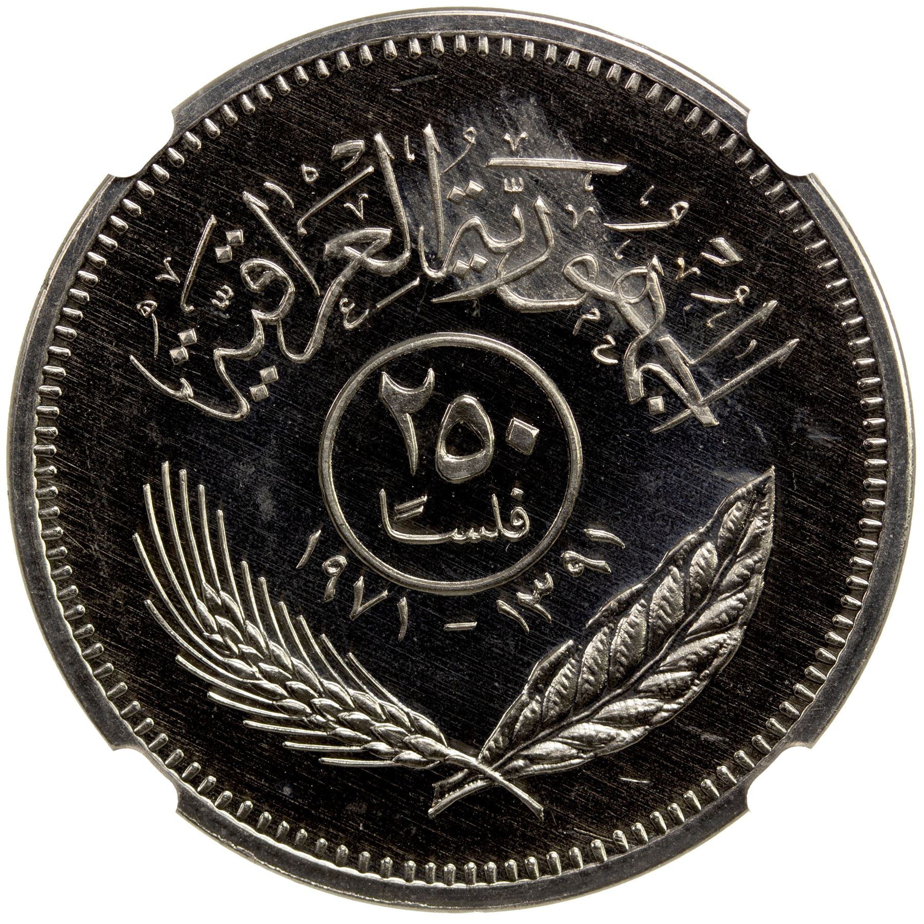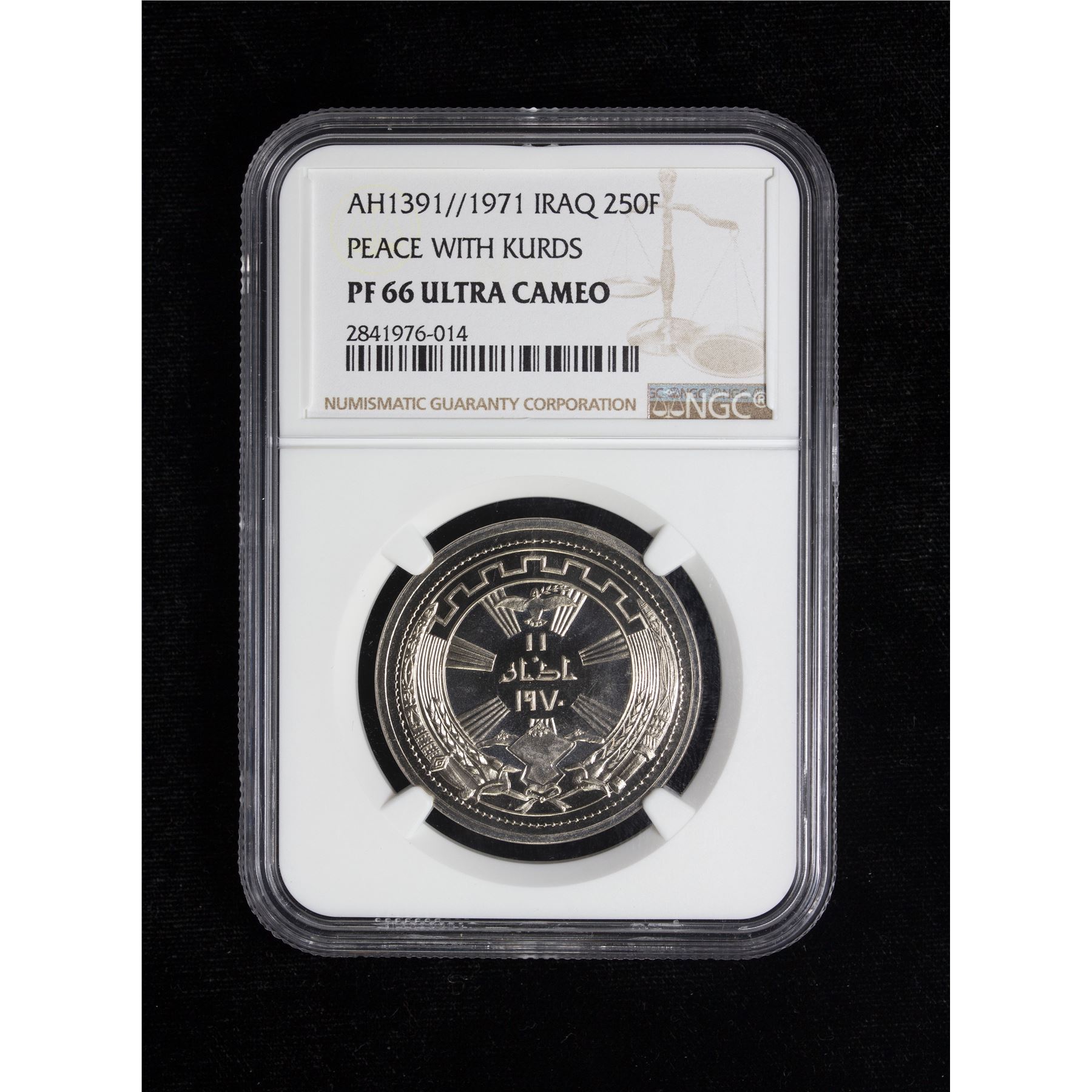 IRAQ: Republic, 250 fils, 1971/AH1391, KM-131, First Anniversary of Peace with Kurds, NGC graded Proof 66 Ultra Cameo.