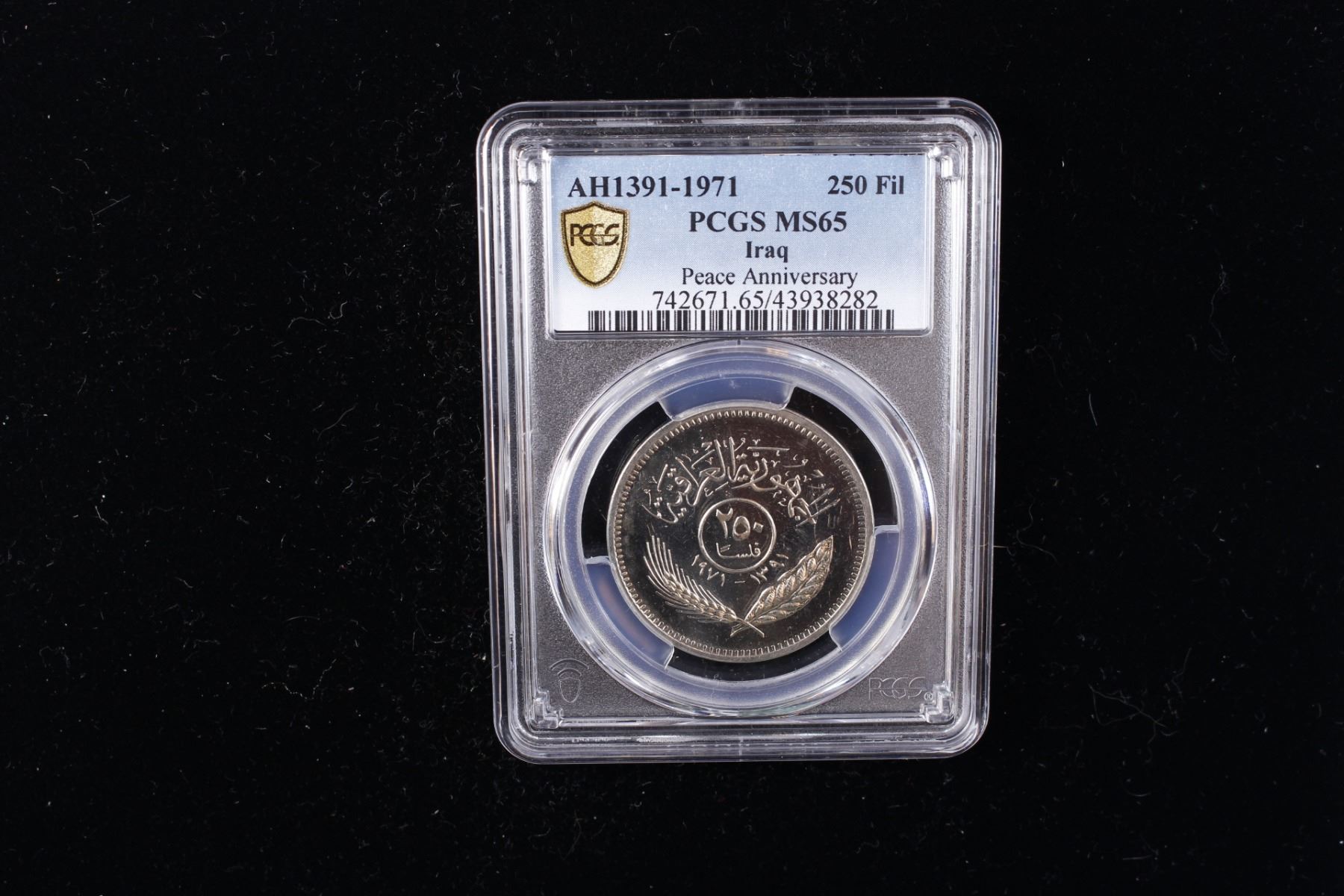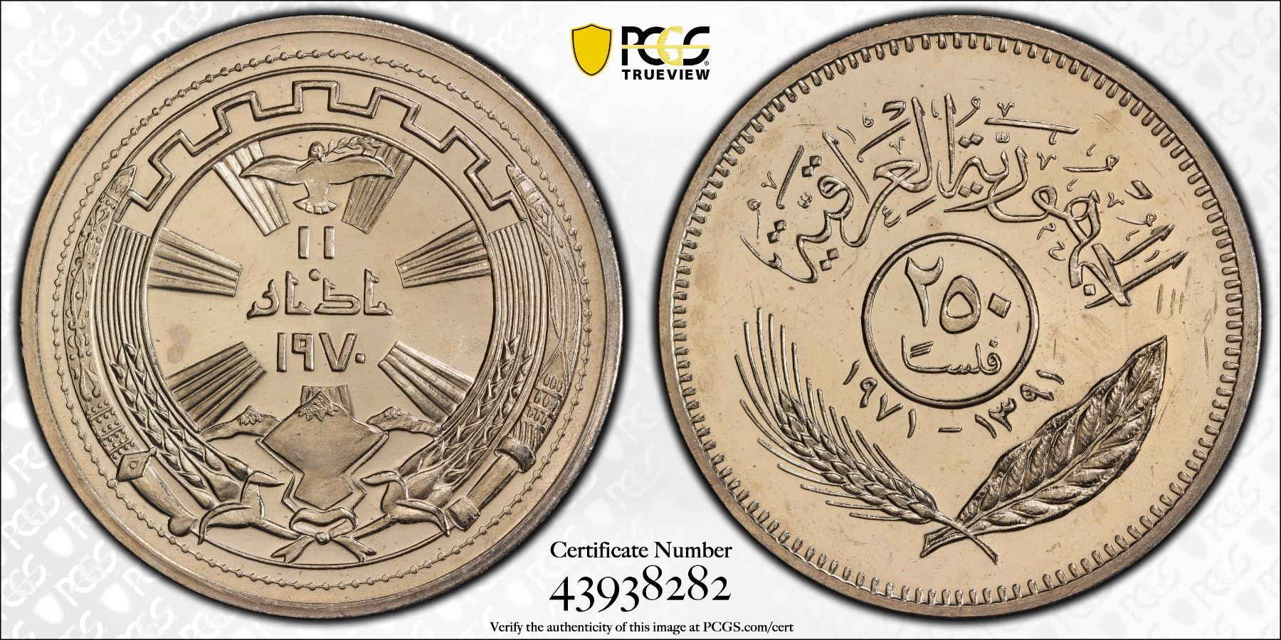 IRAQ: Republic, 250 fils, 1971/AH1391, KM-131, 1st Anniversary of Peace with the Kurds, prooflike (though not noted on label), PCGS graded MS65.