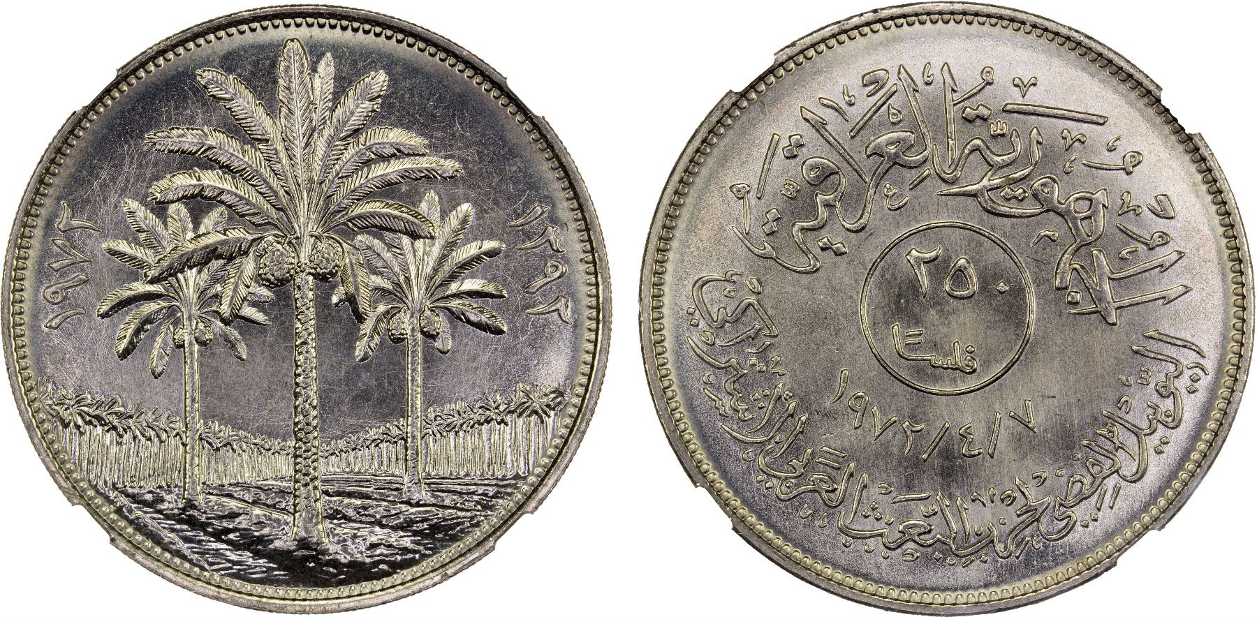 IRAQ: Republic, 250 fils, 1972/AH1392, KM-135, 25th Anniversary of Arabic Ba'ath party, superb blazing luster, NGC graded MS67.