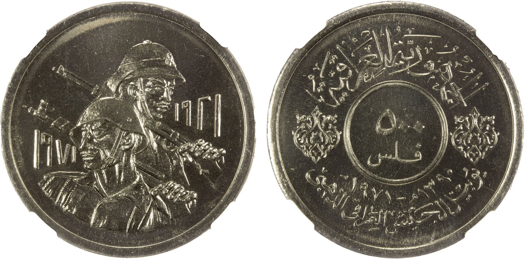 IRAQ: Republic, 500 fils, 1971/AH1390, KM-132, 50th Anniversary of Iraqi Army, NGC graded MS66.