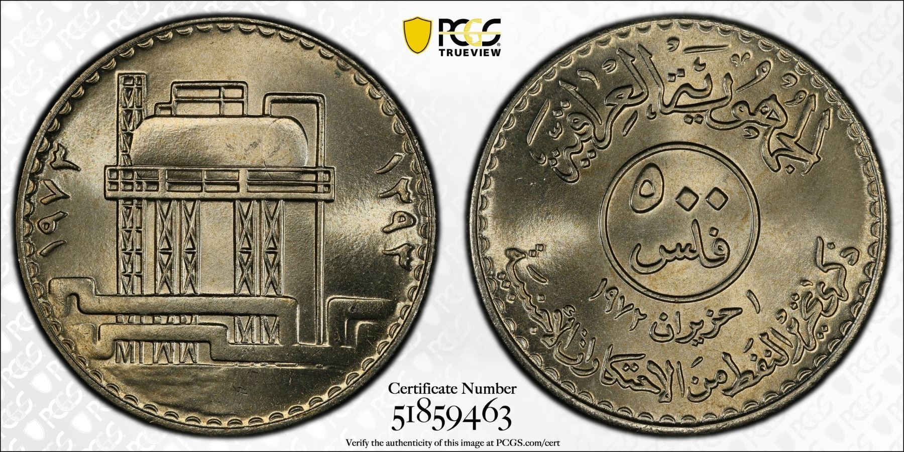 IRAQ: Republic, 500 fils, 1973/AH1393, KM-139, Oil Nationalization issue, an incredible example, PCGS graded MS67, ex Almer H. Orr III Collection.