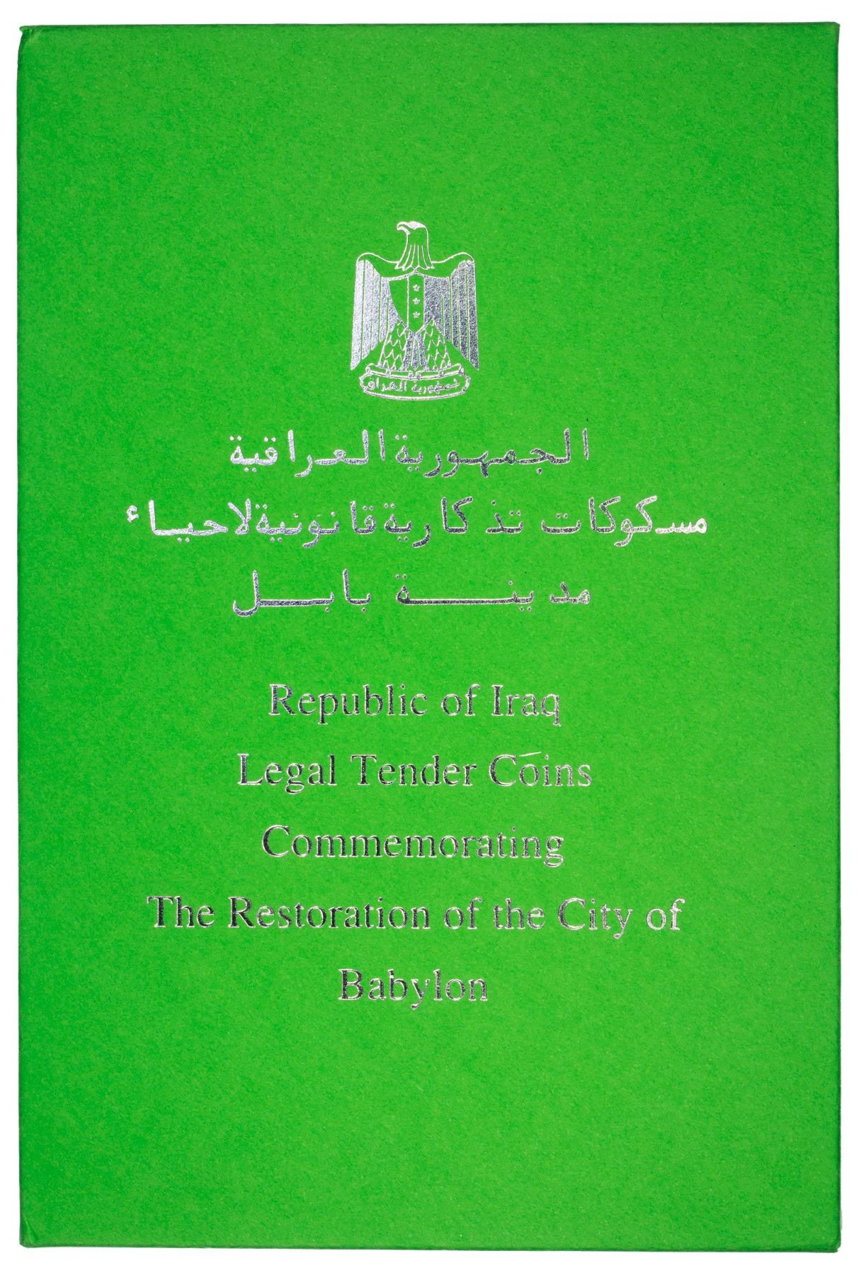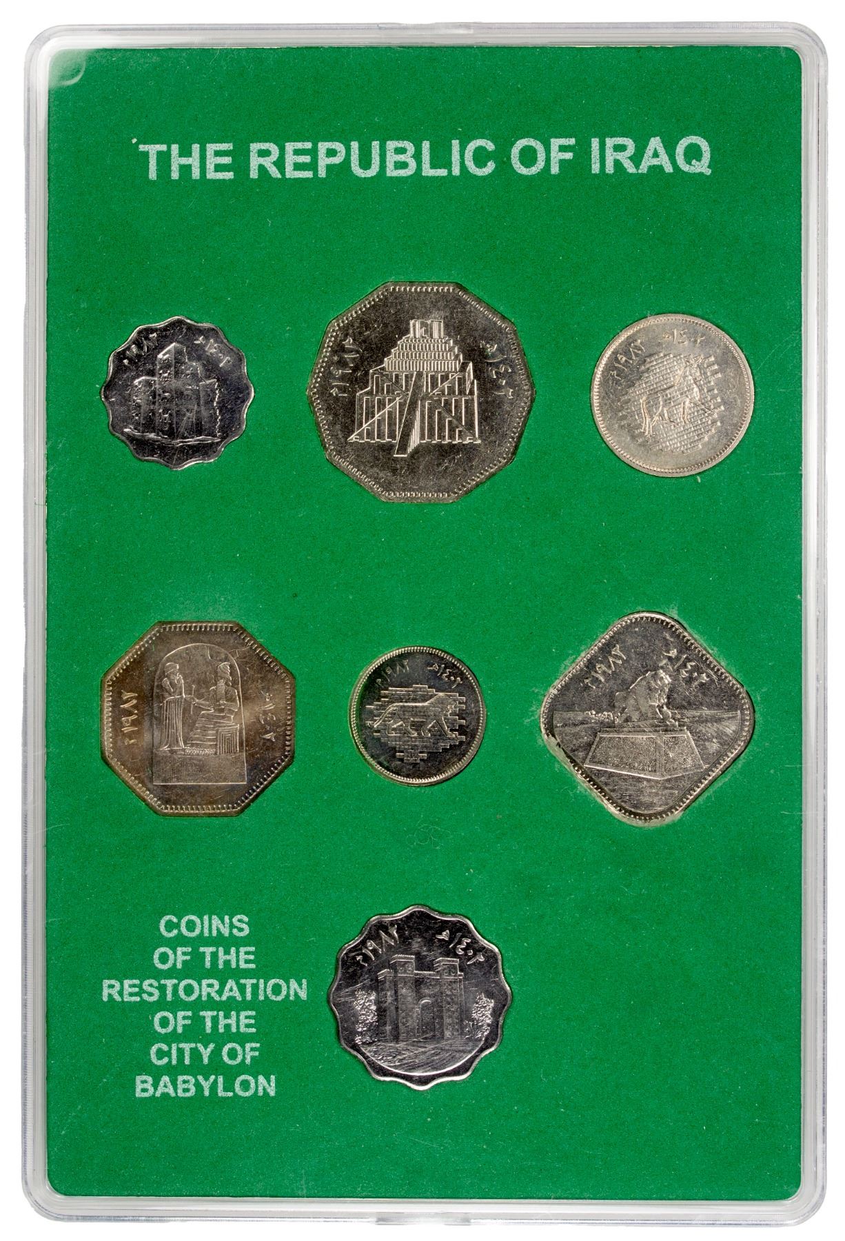 IRAQ: Republic, 7-coin mint set, 1982/AH1402, privately issued set of the Restoration of the City of Babylon commemorative series, with 5 fils, 10 fils, 25 fils, 50 fils, 250 fils, 500 fils, and 1 dinar (=1000 fulus) types; all Unc to BU, all housed in an attractive locally made acrylic display case inside green paper sleeve; set of 7 coins.