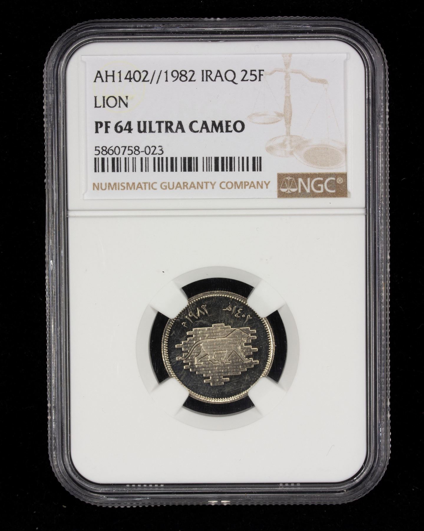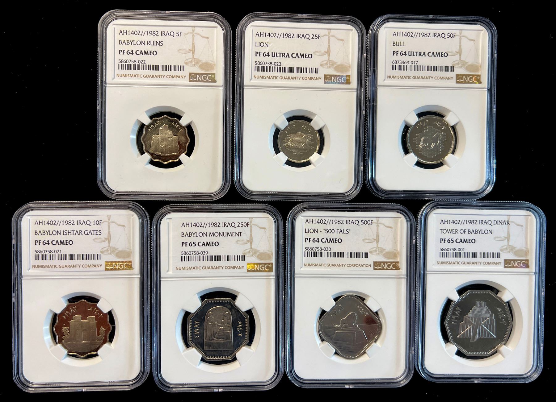 IRAQ: Republic, 7-coin proof set, 1982/AH1402, KM-PS6, Restoration of Babel commemorative series, with 5 fils (Ishtar Gate, KM-159a; PF64 Cameo), 10 fils (Ishtar Gate, KM-160a; PF64 Cameo), 25 fils (lion, KM-161; PF64 Ultra Cameo), 50 fils (bull, KM-162; PF64 Ultra Cameo), 250 fils (Code of Hammurabi, KM-163; PF65 Cameo), 500 fils (Lion of Babylon, KM-168; PF64 Cameo), and 1 dinar (Tower of Babylon, KM-164; PF65 Cameo), all in NGC proof holders, a well-matched set with great eye appeal! set of 7 slabs.