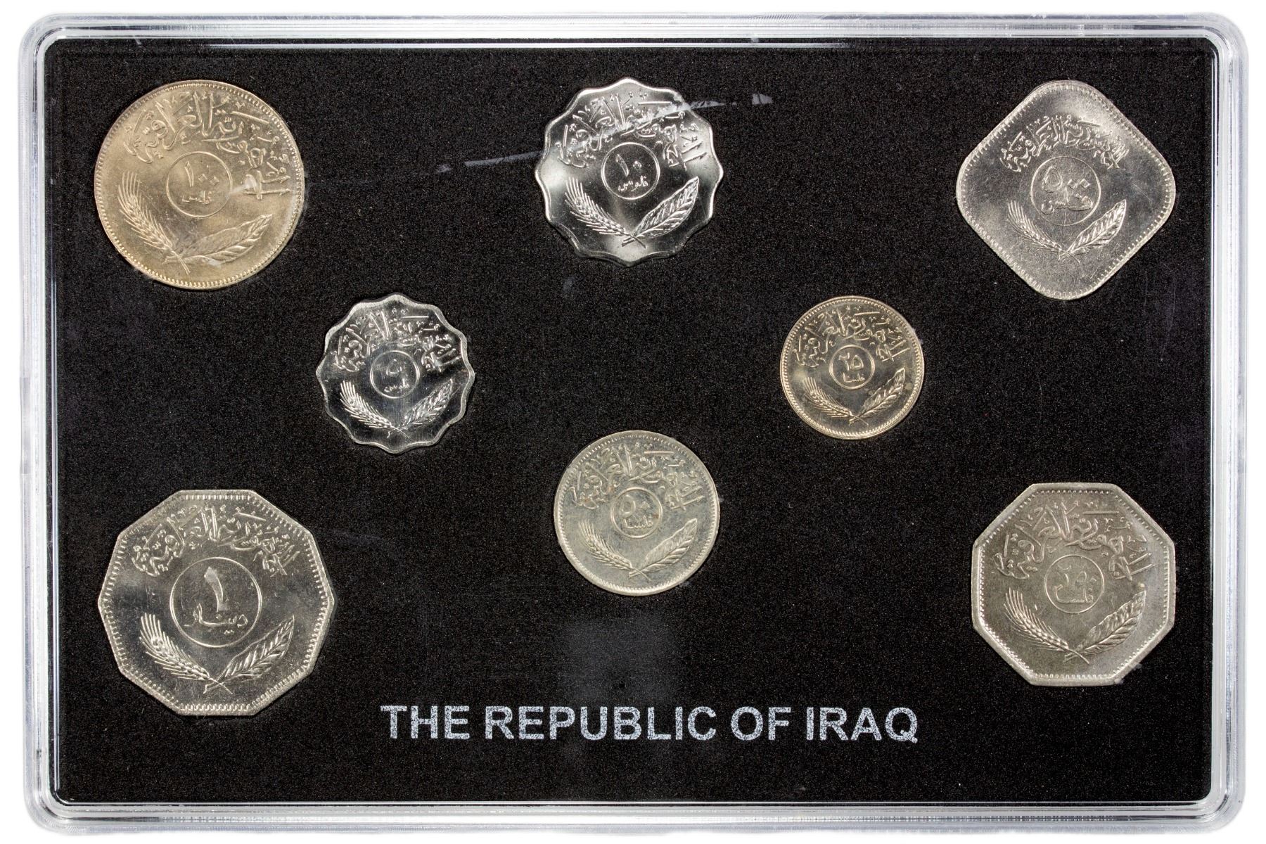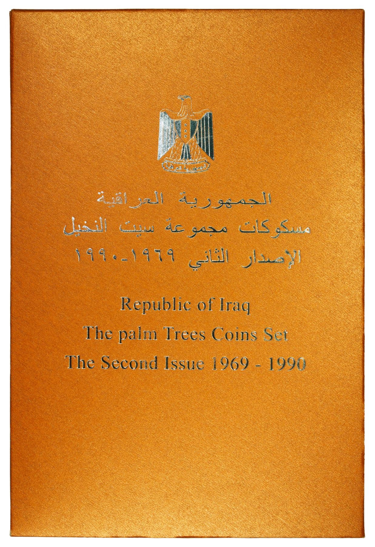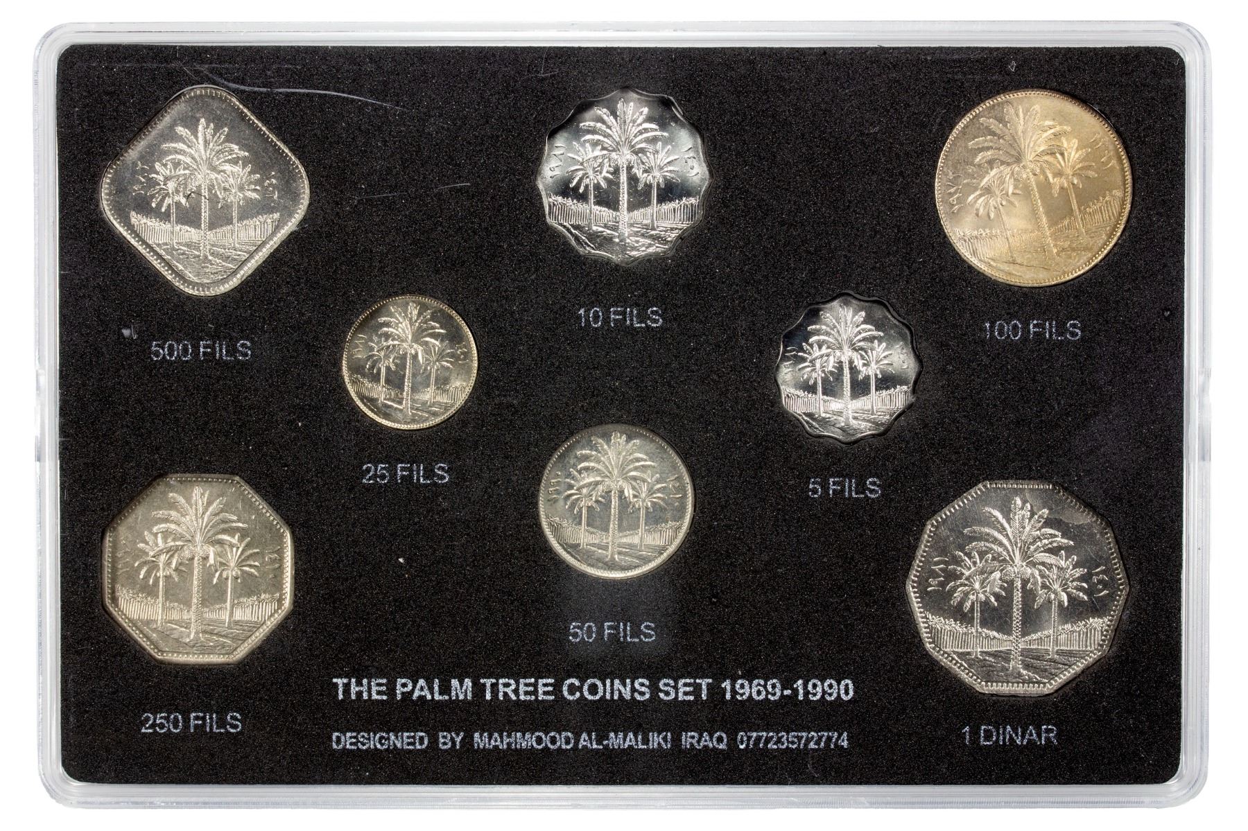 IRAQ: Republic, 8-coin mint set, various dates (1969-1990), privately issued set of the 'Palm Tree' series from 1969-90, with 5 fils, 10 fils, 25 fils, 50 fils, 100 fils, 250 fils, 500 fils, and 1 dinar (=1000 fulus) types; most BU, all housed in an attractive locally made acrylic display case inside copper-colored paper sleeve; set of 8 coins.