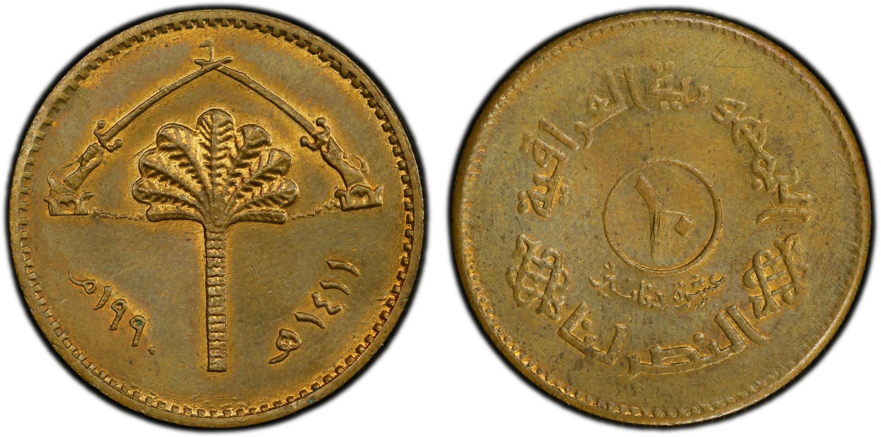 IRAQ: Republic, AE 10 dinars, 1990/AH1411, KM-172, Schön-78, "Victory Arch" Monument in Baghdad above palm tree, pleasantly lustrous and extremely rare, PCGS graded MS62 RB, ex Dr. Wolfgang Schuster Collection. Rare issue not released into circulation and struck at the Sudan Mint House, Khartoum.