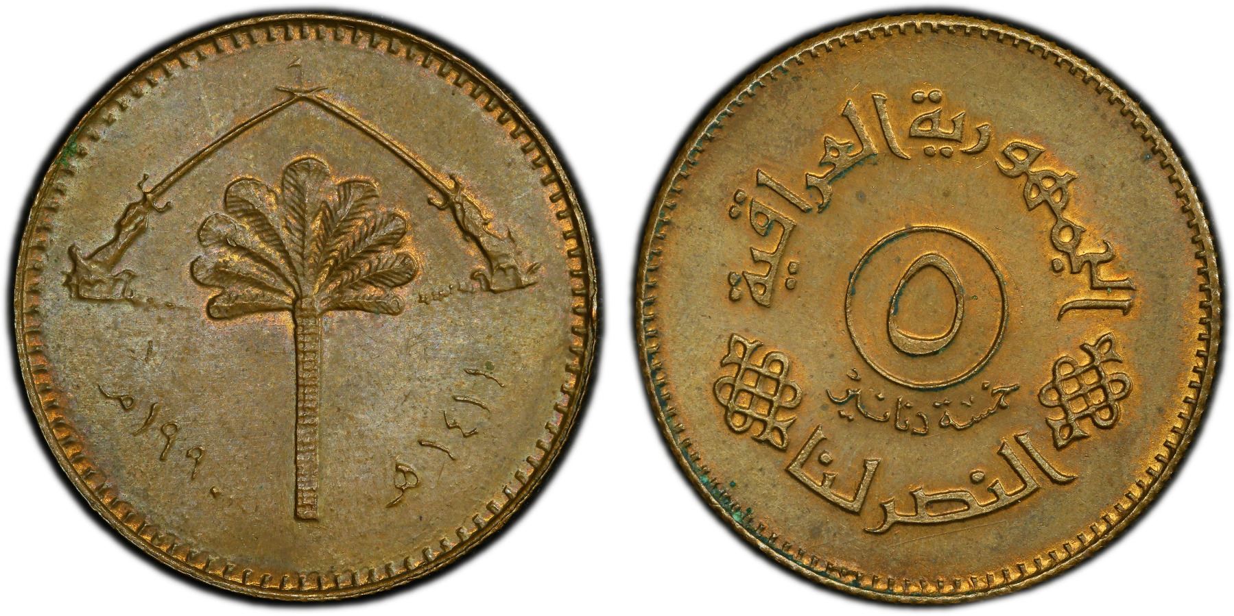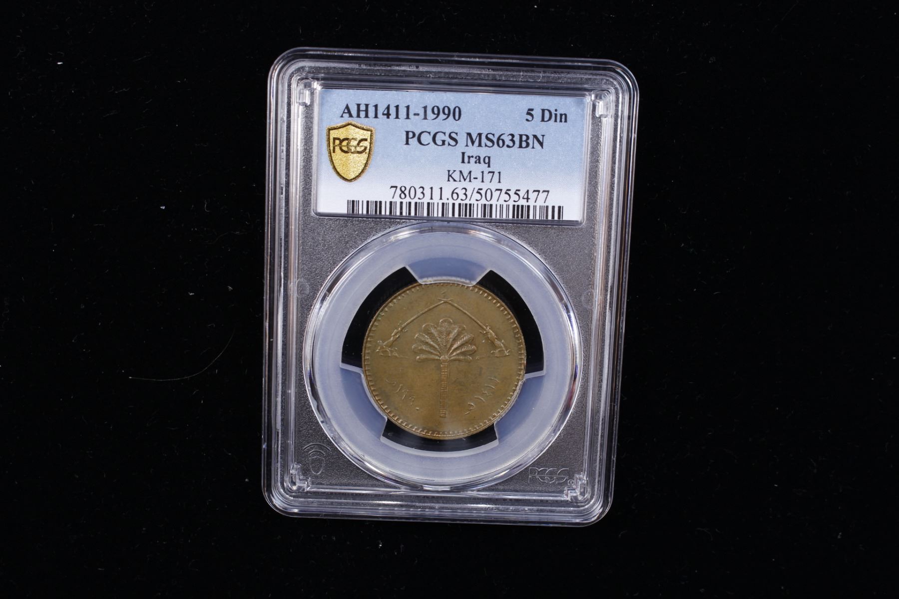 IRAQ: Republic, AE 5 dinars, 1990/AH1411, KM-171, Schön-77, "Victory Arch" Monument in Baghdad above palm tree, lustrous, light chocolate brown color with hints of red, PCGS graded MS63 BN, ex Dr. Wolfgang Schuster Collection. Rare issue not released into circulation and struck at the Sudan Mint House, Khartoum.