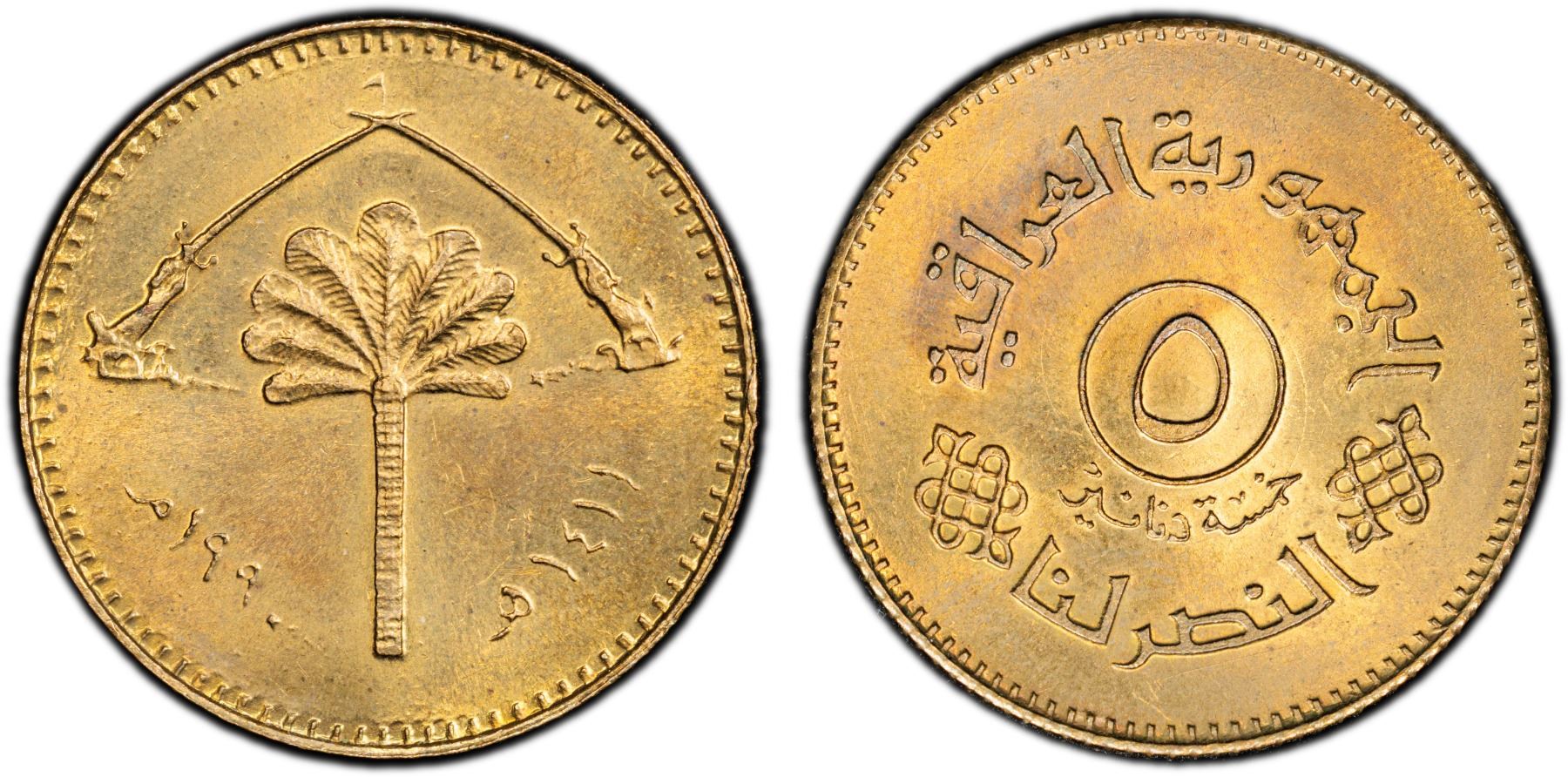 IRAQ: Republic, AE 5 dinars, 1990/AH1411, PCGS MS63 RB
