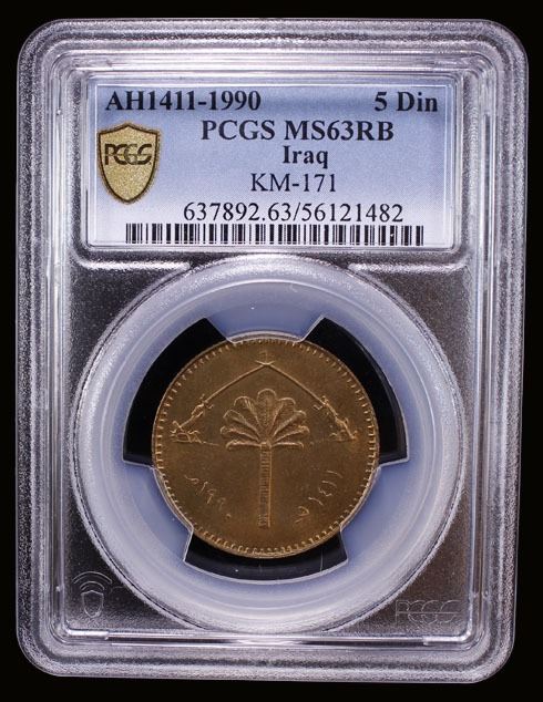 IRAQ: Republic, AE 5 dinars, 1990/AH1411, KM-171, Schön-77, "Victory Arch" Monument in Baghdad above palm tree, a lovely mint state example for type! PCGS graded MS63 RB. Rare issue not released into circulation and struck at the Sudan Mint House, Khartoum.