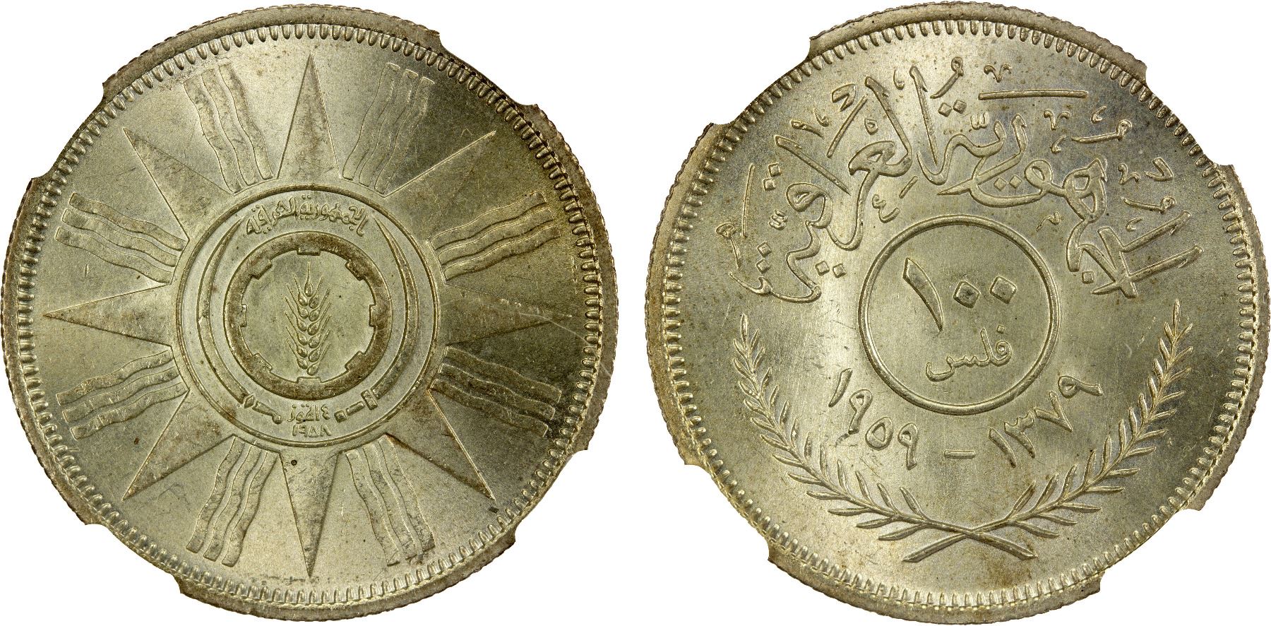 IRAQ: Republic, AR 100 fils, 1959/AH1379, KM-124, just a hint of tone, lustrous, one-year type, NGC graded MS64.