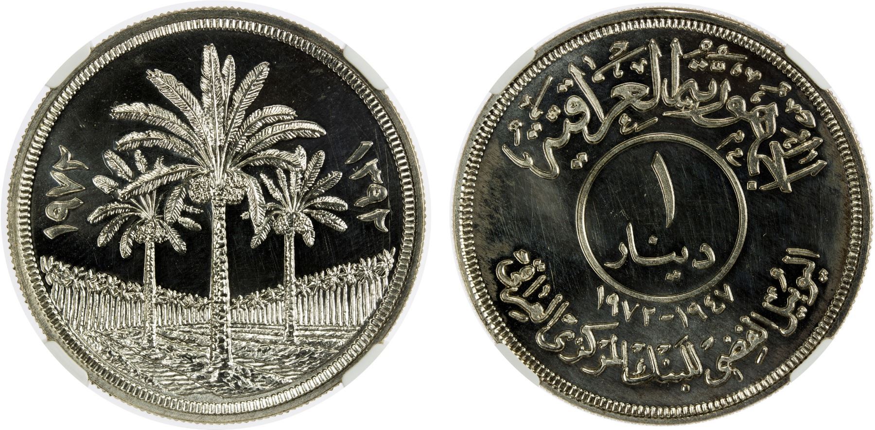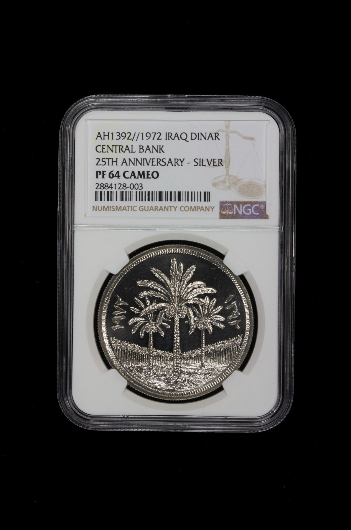 IRAQ: Republic, AR dinar, 1972/AH1392, KM-137, 25th Anniversary of the Central Bank of Iraq, NGC graded Proof 64 CAMEO.