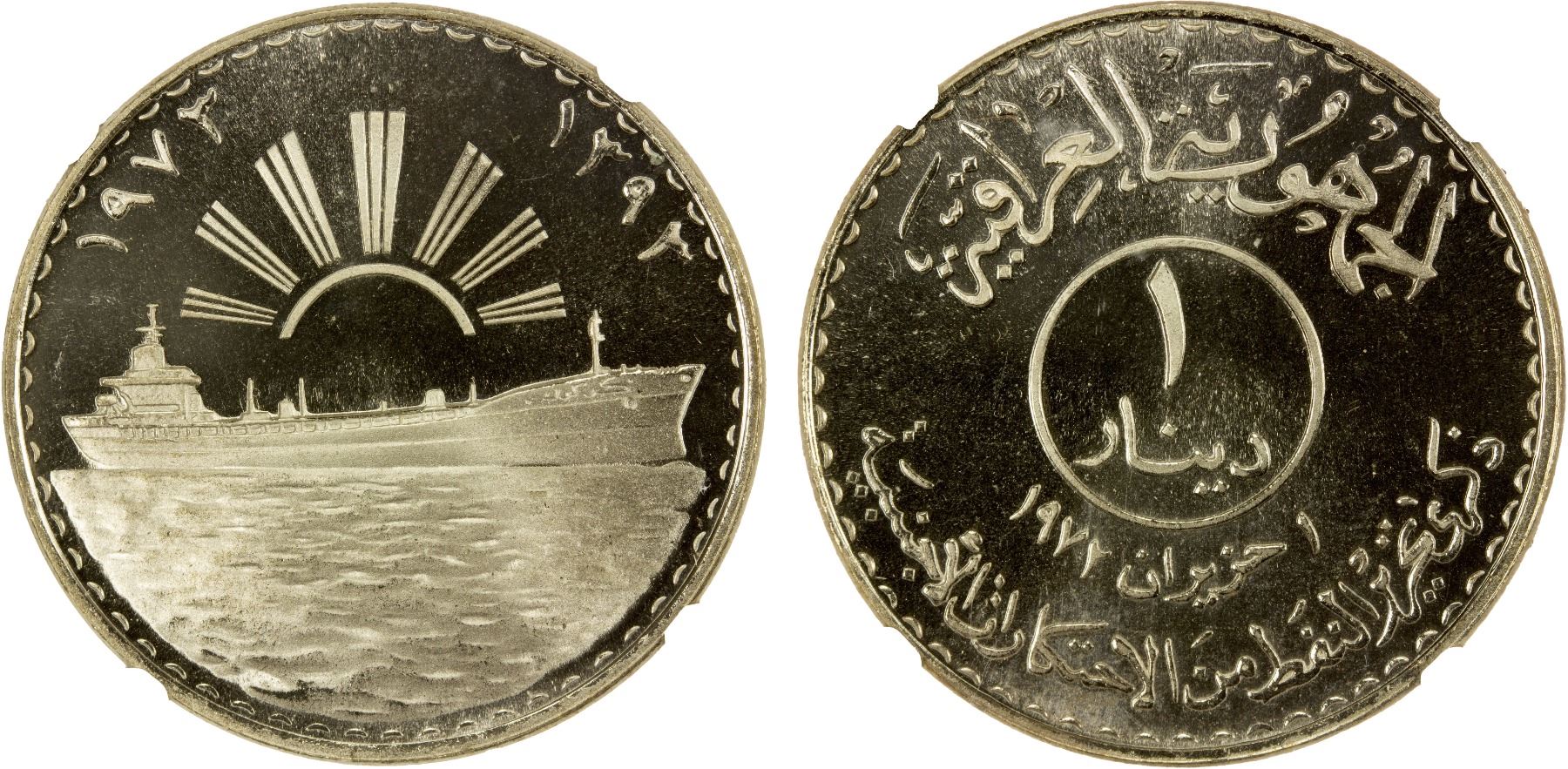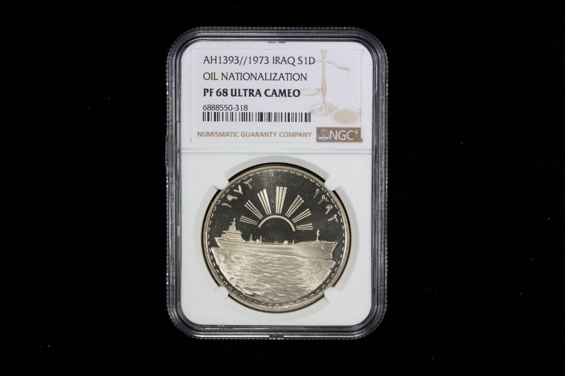 IRAQ: Republic, AR dinar, 1973/AH1393, KM-140, Oil Nationalization issue, a spectacular example, NGC graded PF68 Ultra Cameo.