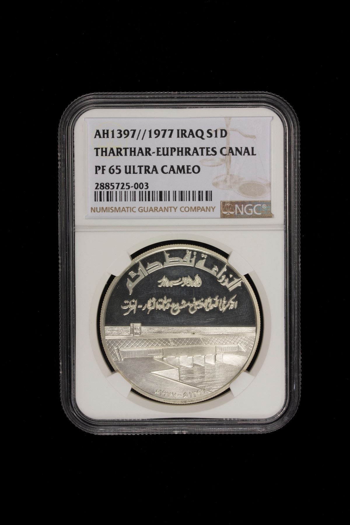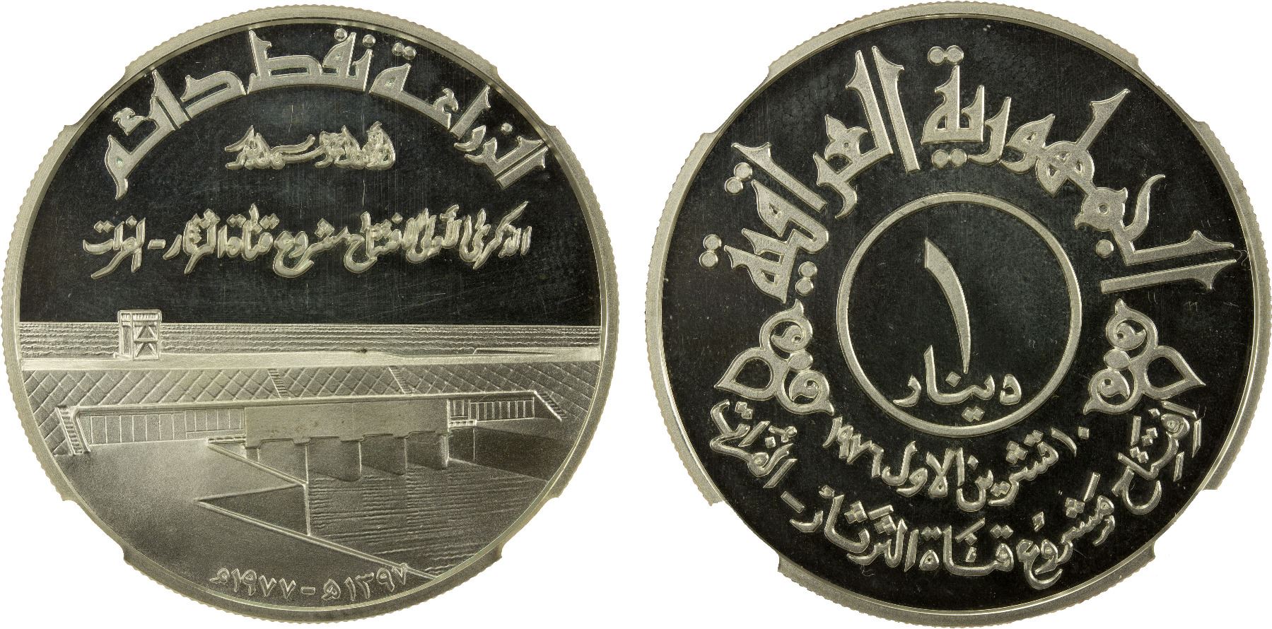IRAQ: Republic, AR dinar, 1977/AH1397, KM-143, Inauguration of Tharthat-Euphrates Canal, mintage of only 7,000 pieces; superb glorious example! NGC graded PF65 Ultra Cameo.