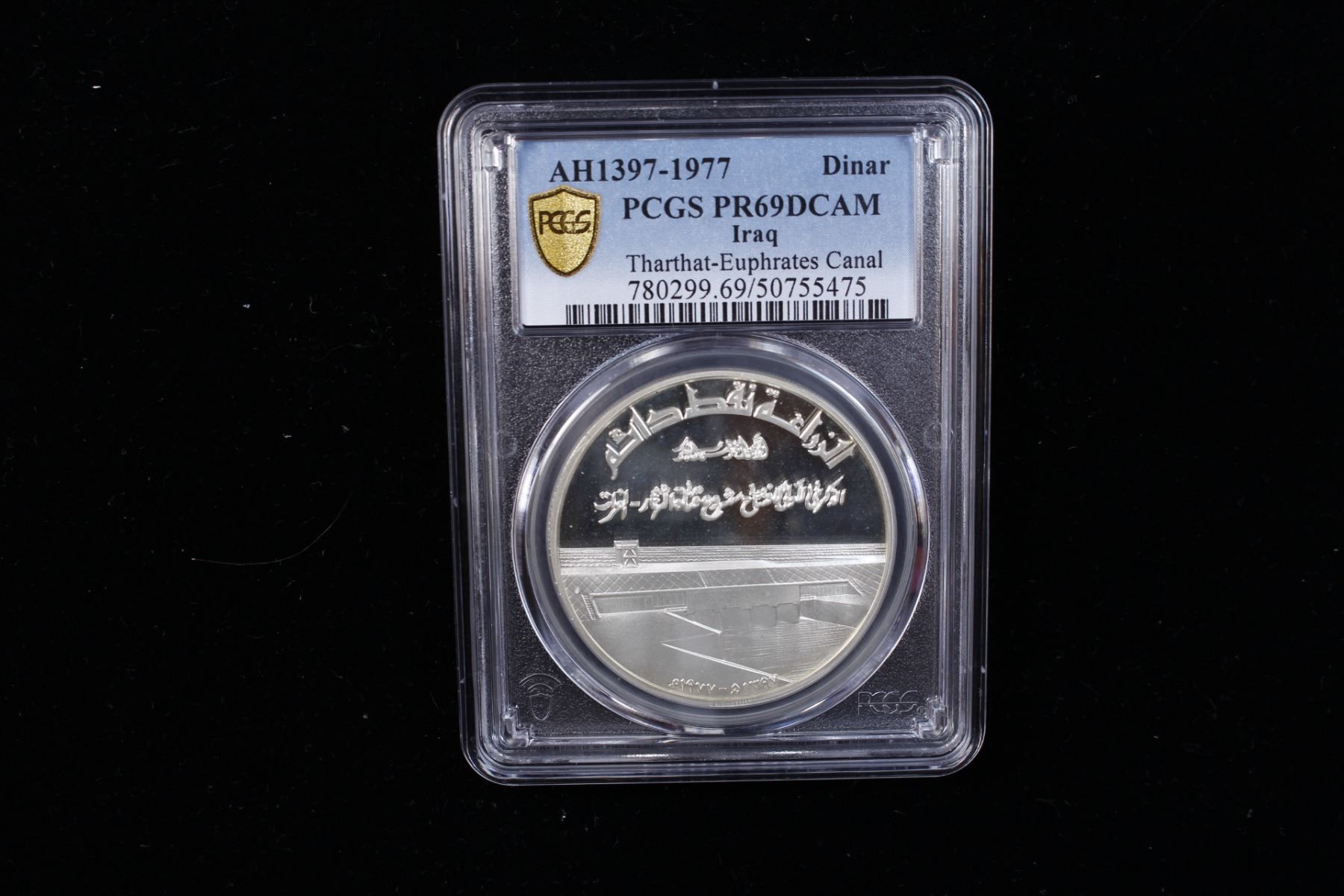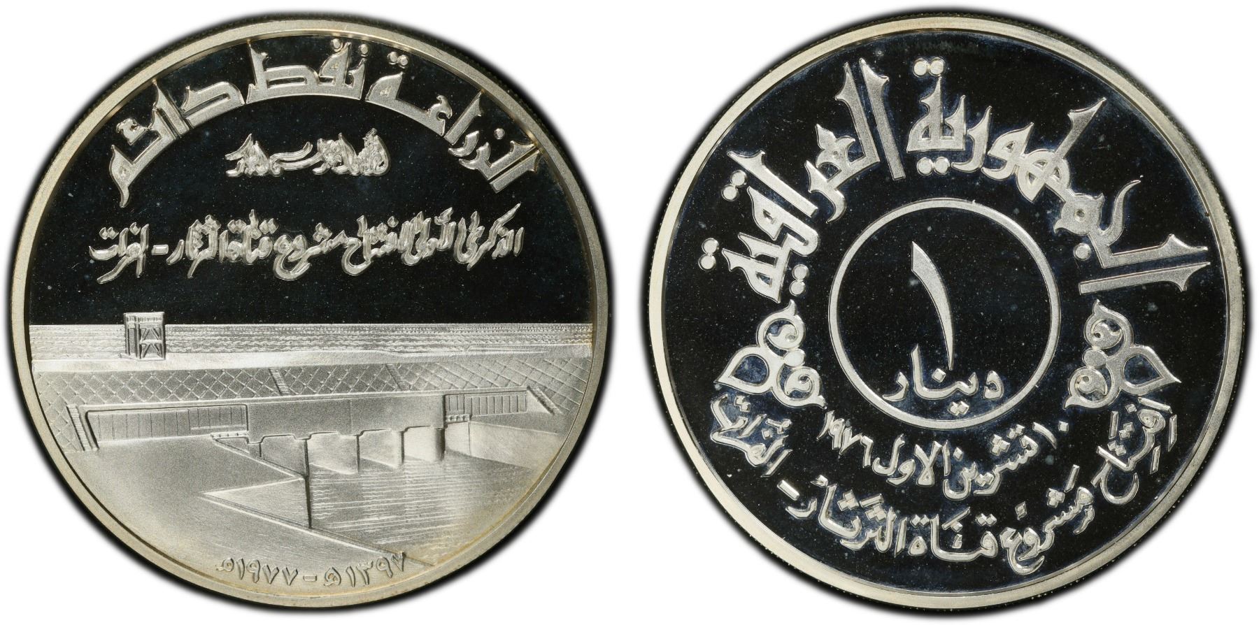 IRAQ: Republic, AR dinar, 1977/AH1397, KM-143, Commemorating the Opening of Tharthar-Euphrates Canal, a magnificent reflective proof example! PCGS graded Proof 69 DCAM, ex Dr. Wolfgang Schuster Collection. A modern marvel that supports life in Iraq and generates power for the region. The main purpose of the Tharthar Lake is to collect excess water of the Tigris River during flood seasons and to recharge water to the Tigris and Euphrates Rivers during dry seasons, when there is shortage of water in both rivers. Moreover, it aims to wash out the salts from the stored water in the lake by means of natural continuous draining of the stored water.