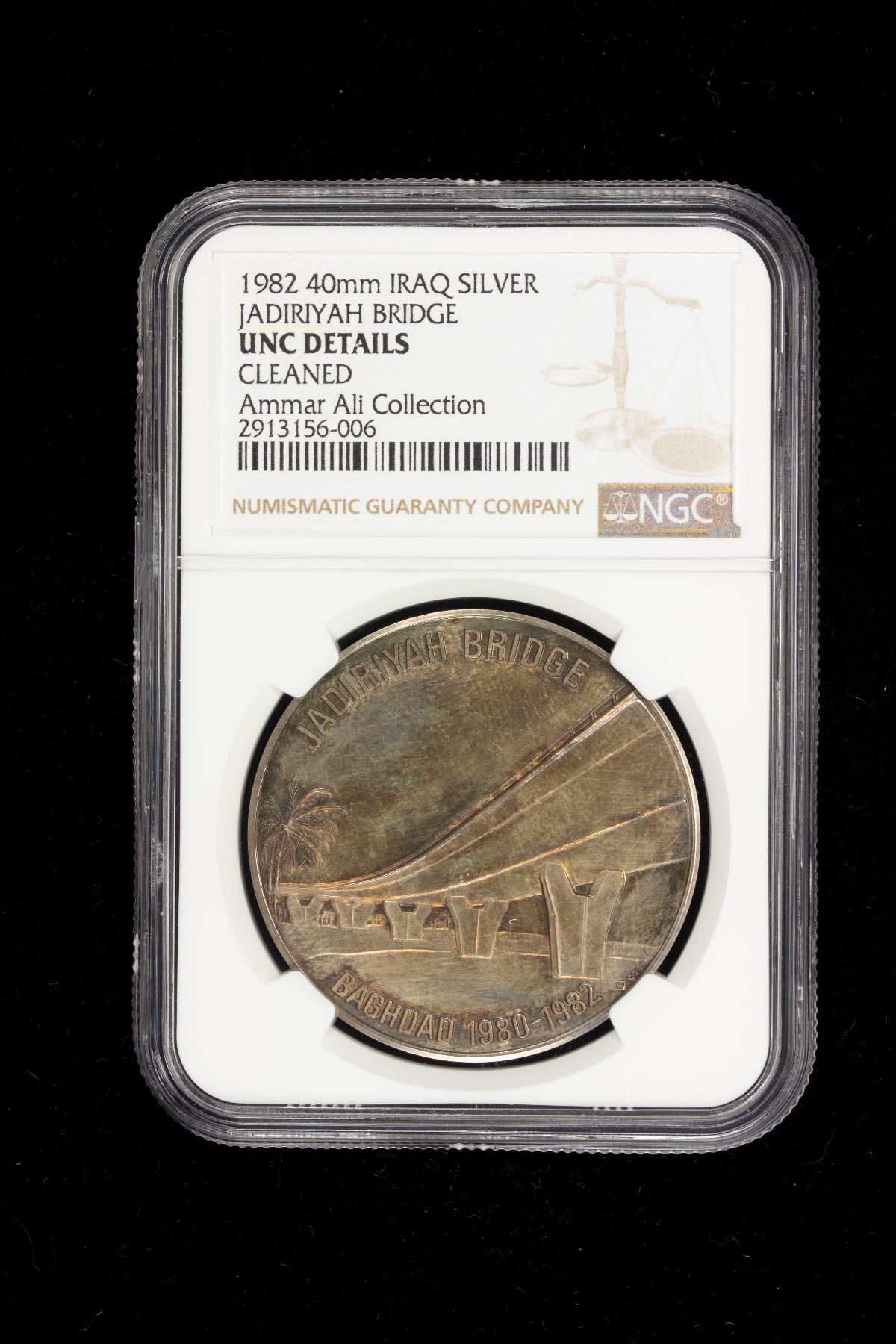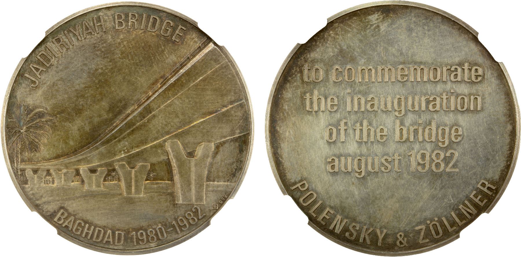 IRAQ: Republic, AR medal, 1982, 40mm silver medal, JADRIYAH BRIDGE - BAGHDAD 1980-1982 around image of bridge // POLENSKY & ZÖLLNER below central text, ITO COMMEOMORATE / THE INAUGURATION / OF THE BRIDGE / AUGUST 1982, struck by Huguenin Frères, Switzerland, cleaned, NGC graded UNC details, ex Ammar Ali Collection. Polensky & Zöllner was once the largest construction company in Iraq until 1987 when the group had to file for bankruptcy. This was triggered by the weak domestic construction industry and the strong dependence on construction activities in Iraq, where significant payment arrears had occurred in the course of the Iraq-Iran war.