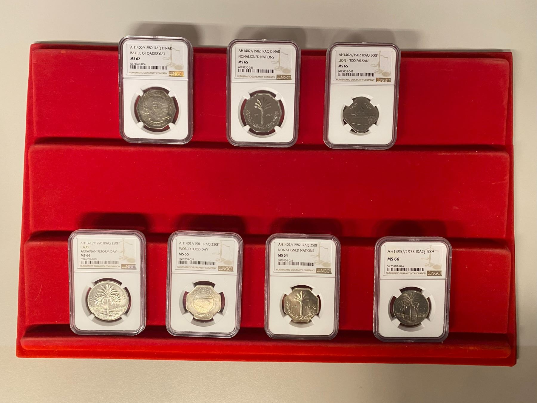 IRAQ: Republic, LOT of 7 certified coins, all in NGC mint-state holders, including 1 dinar (2: 1980 Battle of Qadissiyyah MS62; 1982 Nonaligned Nations MS65), 500 fils (1: 1982 500 Falsan MS65), 250 fils (3: 1970 FAO MS66; 1981 World Food Day MS65; 1982 Nonaligned Nations MS64); 100 fils (1: 1975 MS66); retail value $300, lot of 7 slabs.