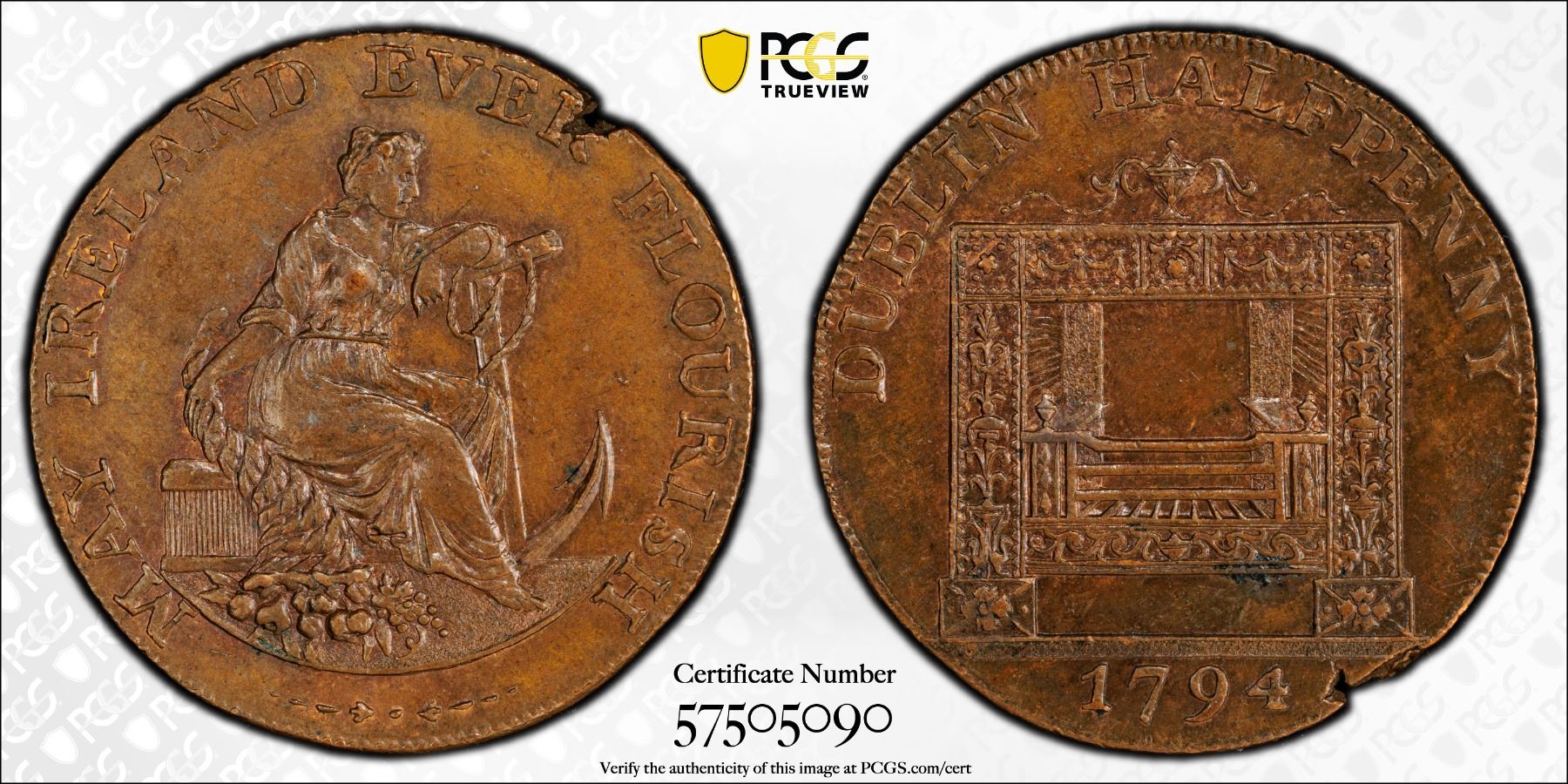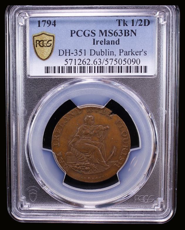 IRELAND: AE halfpenny token, 1794, D&H-351, Conder token, William Parker (ironmonger) of Dublin, female allegory seated right with cornucopia and anchor // ornately decorated register stove, with traces of red color, PCGS graded MS63 BN.