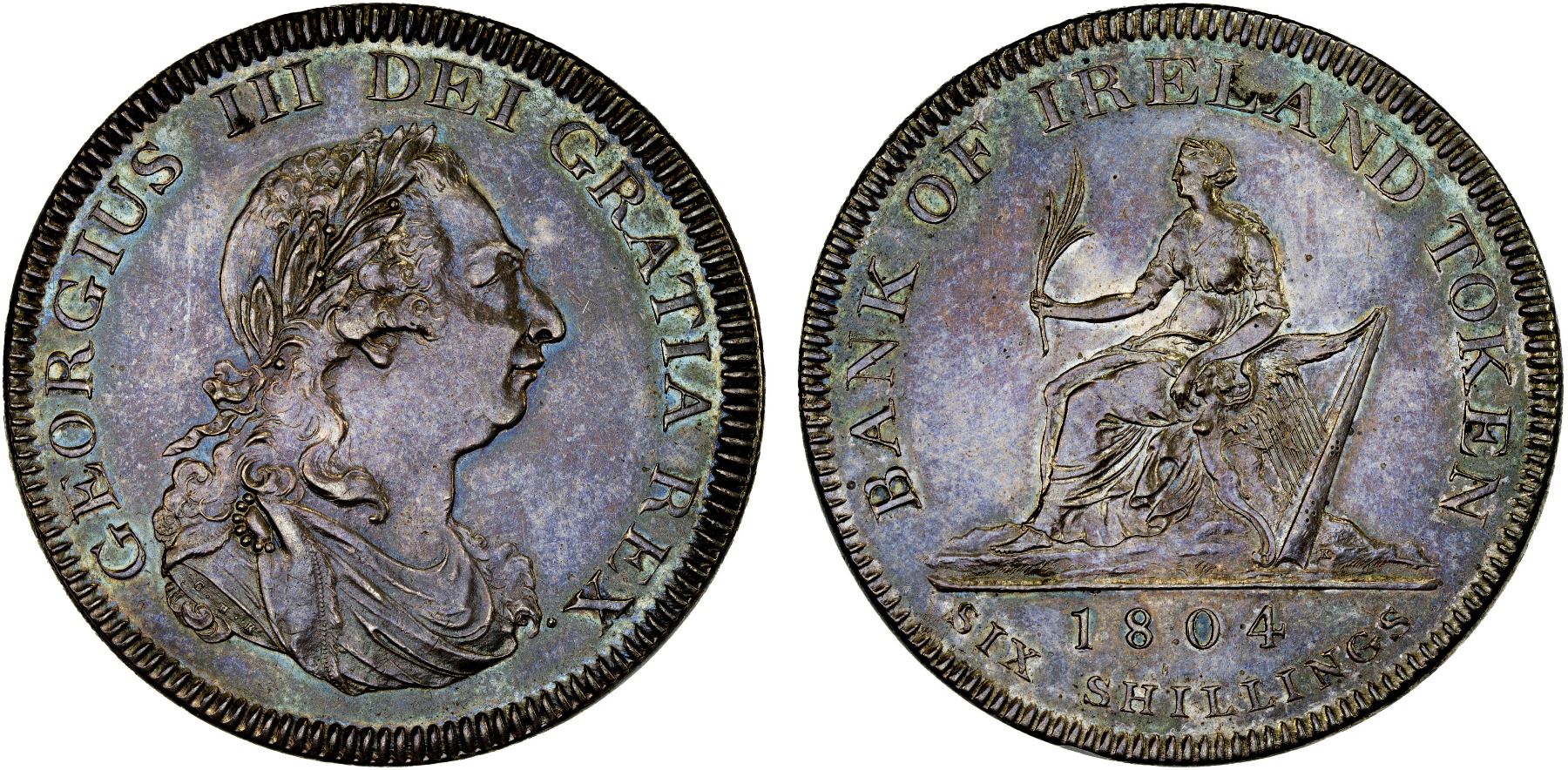 IRELAND: George III, 1760-1820, AR 6 shilling token, 1804, KM-Tn1, Spink-6615, no trace of underlying 8 reales, top leaf points to upright of E in DEI, reverse rim bump, lightly cleaned long ago, but has retoned beautifully and iridescently, XF.