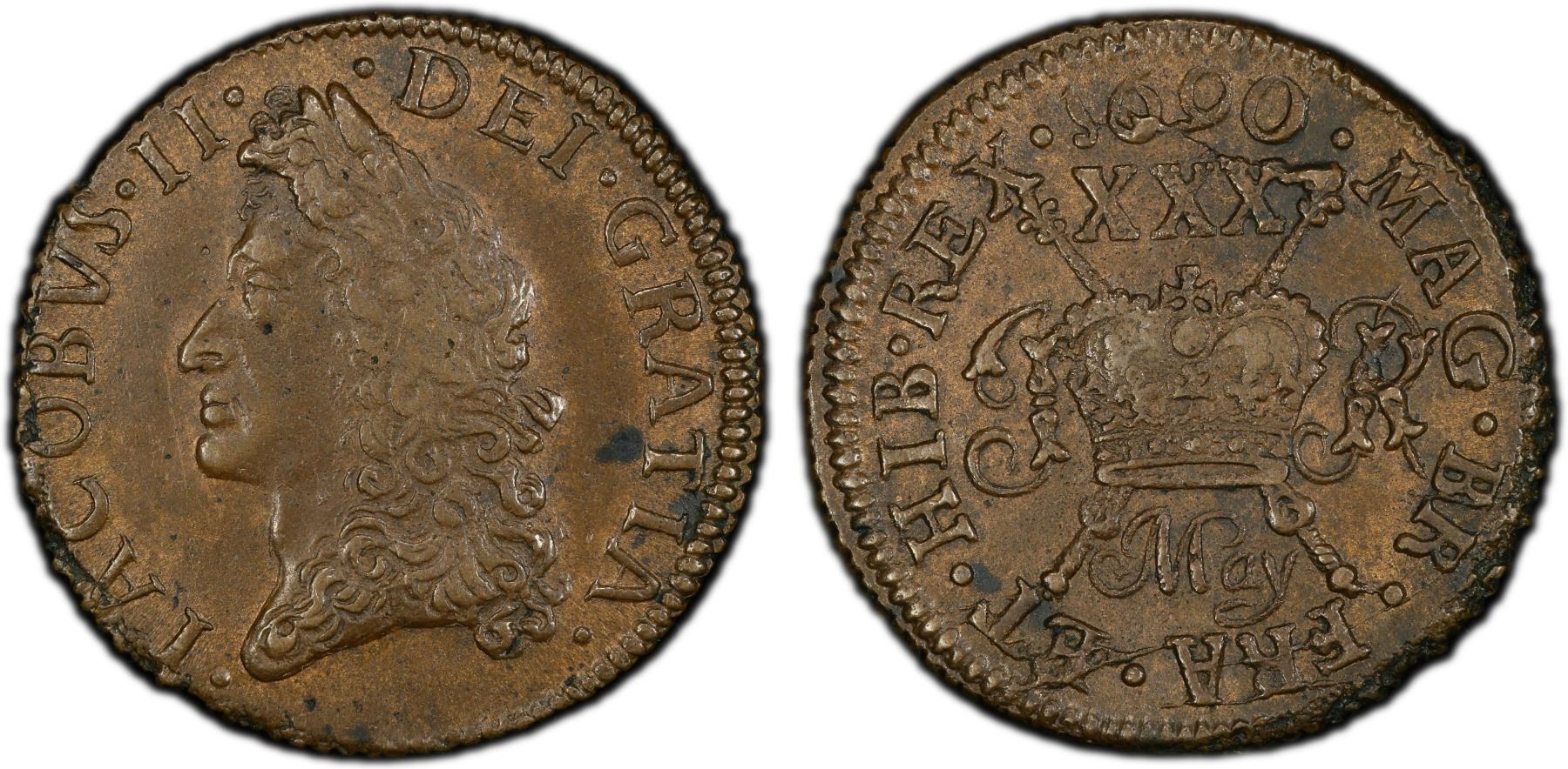 IRELAND: James II, 1685-1691, AE 30 pence (halfcrown), 1690, May, PCGS AU58