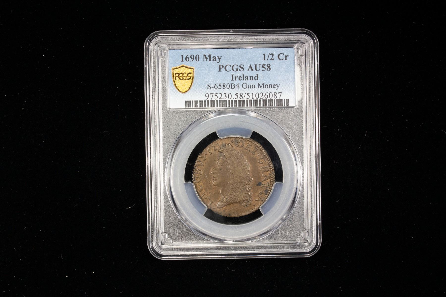 IRELAND: James II, 1685-1691, AE 30 pence (halfcrown), 1690, May, KM-101, S-6580B4, "Gunmoney" type, weakly struck in spots as usual, a scarce and popular type in much nicer than average condition, PCGS graded AU58. Gun money" coins were made by the forces of James II during the Williamite War in Ireland between 1689 and 1691. They were minted in base metal (copper, brass or pewter), and were designed to be redeemed for silver coins following a victory by James II, and consequently bore the date in months to allow a gradual replacement. As James lost the war, that replacement never took place, although the coins were allowed to circulate at much reduced values before the copper coinage was resumed. They were mostly withdrawn from circulation in the early 18th century. The name "gun money" stems from the idea that they were minted from melted down guns. However, many other brass objects, such as church bells, were also used.