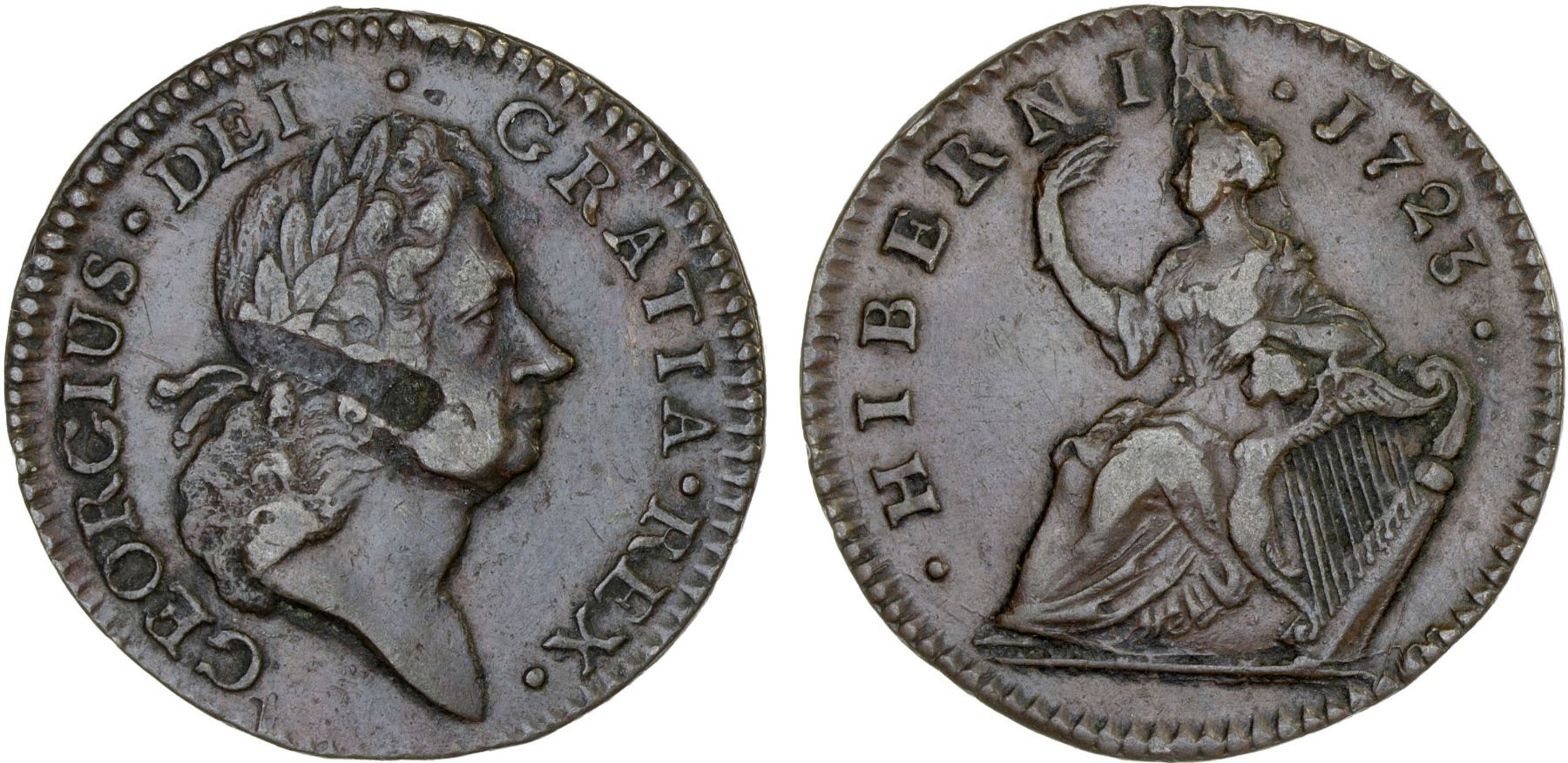 IRELAND: Wood's Hibernia Series, AE 1/2 penny, 1723, KM-117.2, a nice example, rare, VF-XF. Wood's Hibernia series consisted of copper farthing and halfpence bearing dates from 1722 to 1724 although minting did not begin until 1723. A notice in the London Post of January 14, 1723 stated that Wood "...hath erected a building in Phoenix Street, Brown's Graden, near the Seven Dials, for the [Rosa] American[a] coinage, and another in the city of Bristol for the Irish [Hibernia] coinage." William Wood was the owner of several copper and tin mines and hoped to make a profit producing coins for use in Ireland and America.