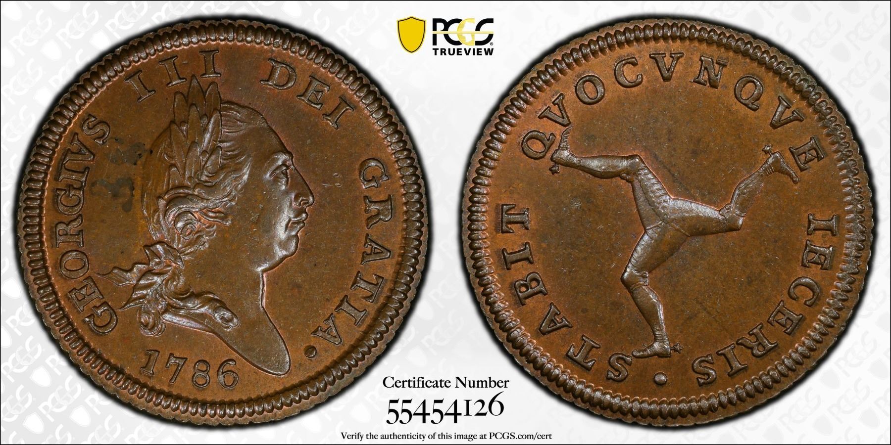 ISLE OF MAN: George III, 1760-1820, AE halfpenny, 1786, PCGS MS64 BN