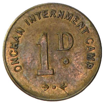 ISLE OF MAN: George VI, 1936-1952, penny token, ND (1941), KM-Tn24, Campbell-5542, Feller IM1421, Onchan WWII Internment Camp token, with reverse die crack, choice About Unc. The Onchan tokens were struck in 1941 by J. R. Gaunt and Son in Birmingham as part of a series of plastic, metallic, and paper currencies for use by German civilians at Onchan, north of Douglas. The penny token comes with and without die break on the reverse.