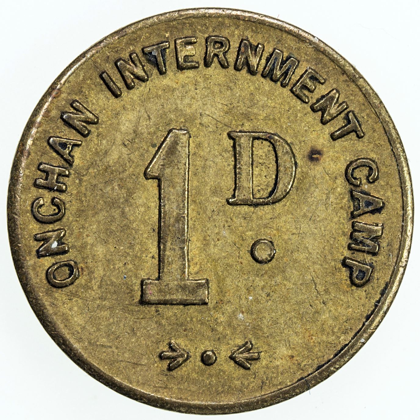 ISLE OF MAN: penny token (2.73g), ND (1941), KM-Tn24, Campbell-5542, Feller & Feller IM-1421, Onchan WWII Internment Camp issue, variety without reverse die crack, a few minor spots, EF. The Onchan tokens were struck in 1941 by J. R. Gaunt and Son in Birmingham as part of a series of plastic, metallic, and paper currencies for use by German civilians at Onchan, north of Douglas.