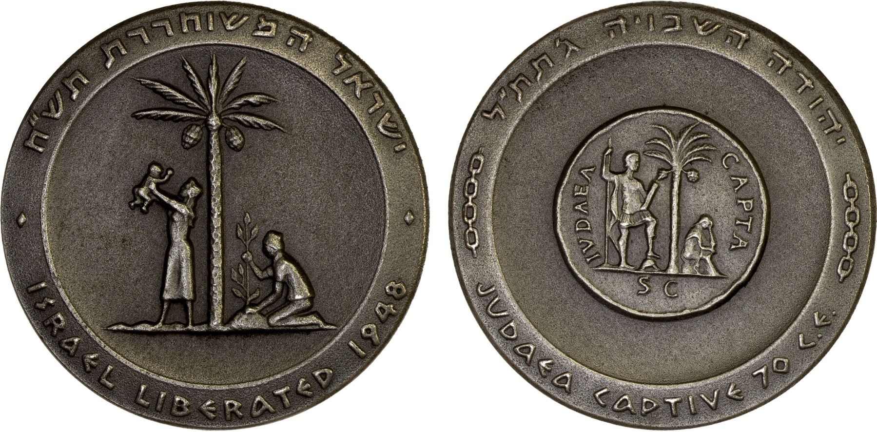 ISRAEL: AR medal (30g), ND (1962), ICMC-25020350, 25mm .935 silver medal by Gerd Rothschild & Zeev Lipman for the Israel Liberation 1948; center within a deep circular incuse, a palm tree, at right, a man planting a tree, on the left a woman joyfully holding a child aloft, around the top rim, the Hebrew inscription: "Israel Liberated, 5708", and at the bottom the identical inscription in English, Israel Liberated 1948 // within a circular incuse stands out a replica of a Roman coin issued by Vespasian commemorating his victory over Judea in the year 70 C.E. In the center of the coin, a palm tree having seven branches, bearing two clusters of fruit. To the left of the tree stands the Emperor in full armor, on his left sits a Hebrew woman, mourning. Around the rim of the Roman coin the Latin inscription: "ludaea Capta" (Judaea Captive). Below, the initials that stand for the words: "By order of the Senate" (S.C.) Round the rim of the medal, chains symbolizing captivity and the Hebrew inscription "Judea in Captivity 3830" and in English: "Judaea Captive, 70 C.E.", struck at the Kretschmer Mint, Jerusalem in antique finish, Unc. The consequences of the great Judean Revolt against Rome which began in 66 CE. had a dire effect upon Jewish history. All the valor and the fierce fanaticism of the defenders could not withstand the onslaughts of the Roman legions stationed locally and later reinforced by two additional legions drawn from the Danube legion and the auxiliary forces recruited from the nearby provinces. The Temple was destroyed in 70 CE. and Titus celebrated his victory.The Romans struck a special series of coins to commemorate the occasion known as the "Judea Capta" series, so named for the inscription on the coins "Judea in Captivity". The palm tree on the coins generally stands for Judea. At the side of the tree, a Jewish captive (a man or a woman), prizes of war, an image of the victorious Emperor, or other representatives.The "Liberation" medal was first issued by Israel in 1958 in connection with its Tenth Anniversary. The State Medal depicts the contrast - the destruction of the Temple versus the renewal of Jewish Independence in our time. A Hebrew farmer planting a sapling in place of a Jewish captive hand bound; a jubilant Hebrew mother holding her infant aloft instead of the sorrowful Jewish woman weeping for the destruction of her homeland.
