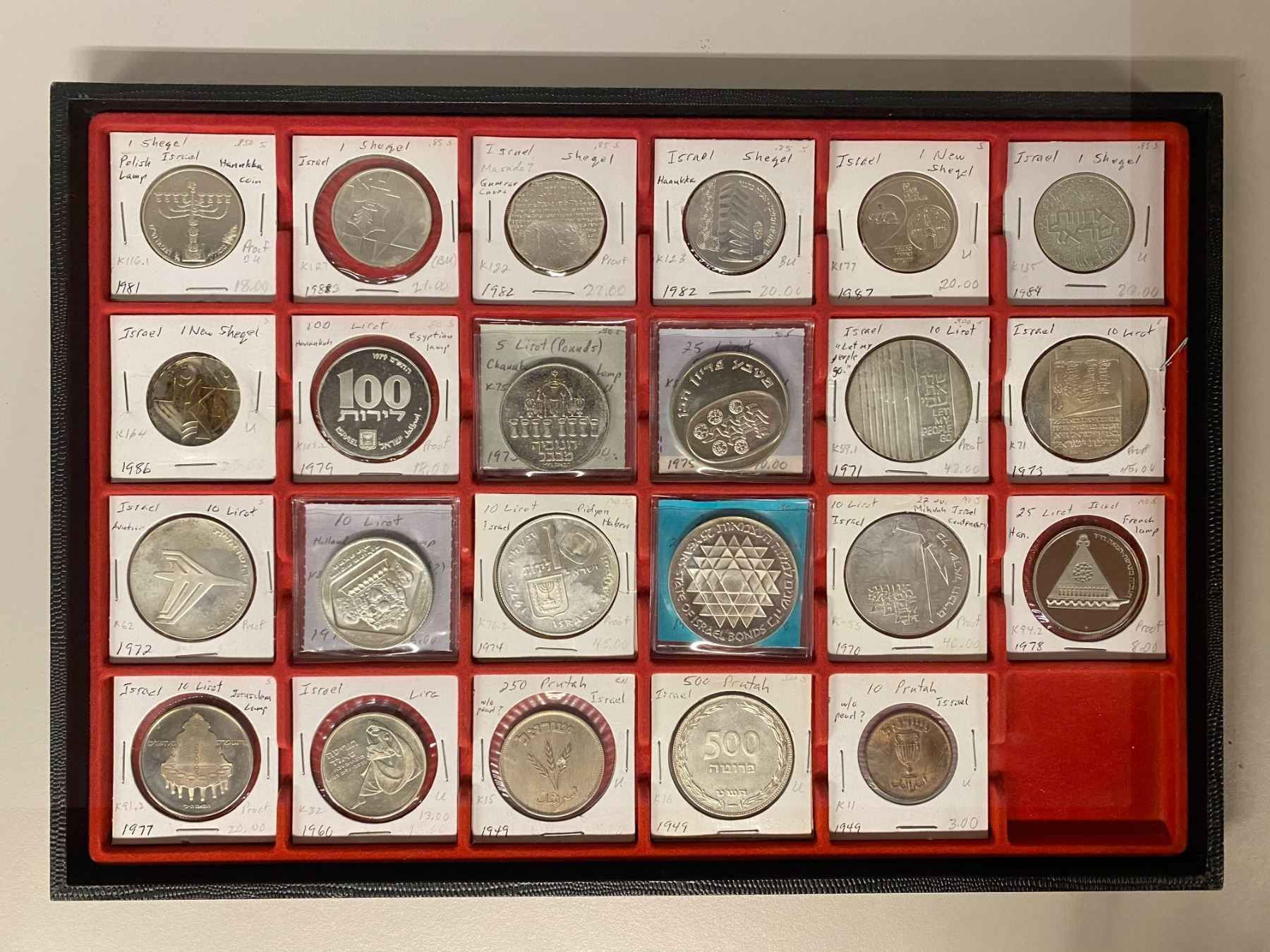ISRAEL: LOT of 23 coins, including an UNC 1949 500 pruta, 3 modern copper nickel crowns, 10 silver crowns from 1970 to 1979, 7 silver 1/2 crown sized coins (approx 33mm), and 2 others; retail value $600, lot of 23 pieces.
