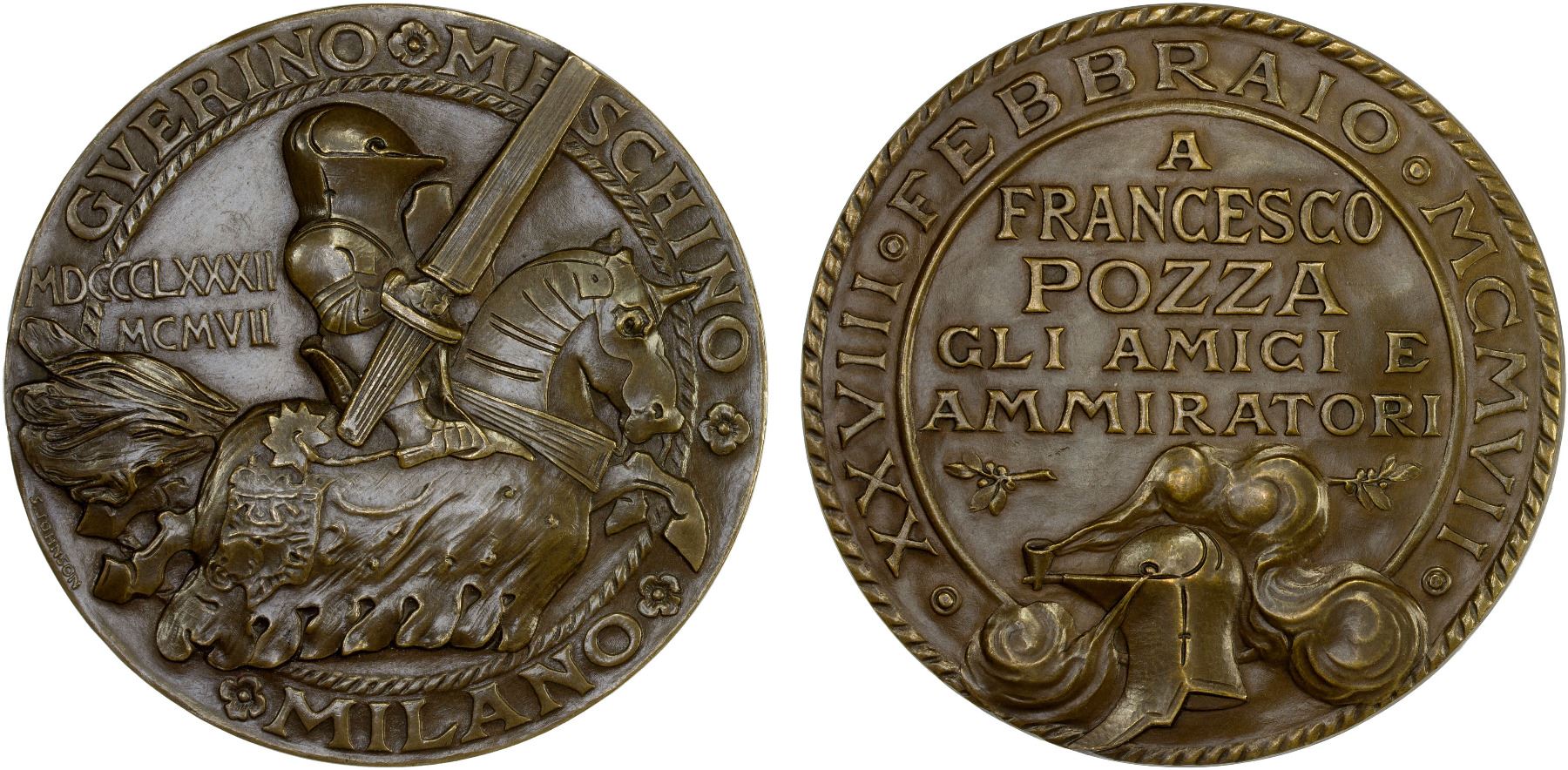 ITALY: AE medal (120.64g), 1907, 62mm bronze medal by Stefano Johnson for the satirical periodical "Guerin Meschino"; GVERINO MESCHINO above stylized knight with sword on horseback right, MDCCCLXXXII / MCMVII at left, MILANO elow, S. JOHNSON at lover left // XXVIII FEBBRAIO MACMVII in outer legend, A / FRANCESCO / POZZA / GLI AMICI E / AMMIRATORI at center, helmet with smoking pipe below, AU. Medal issued to celebrate the founder of the satirical periodical "Guerin Meschino" Francesco Pozza. "Guerin Meschino" was a weekly satirical magazine which existed in Milan between 1882 and 1949 with an interruption in the period 1925–1943. It had an anti-Fascist and leftist political stance which led to this long-term hiatus.