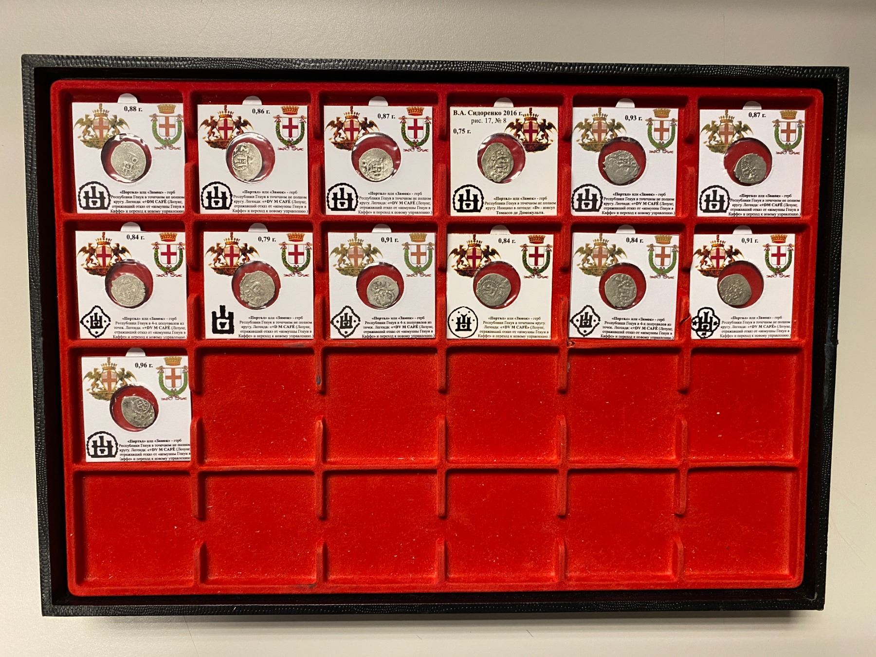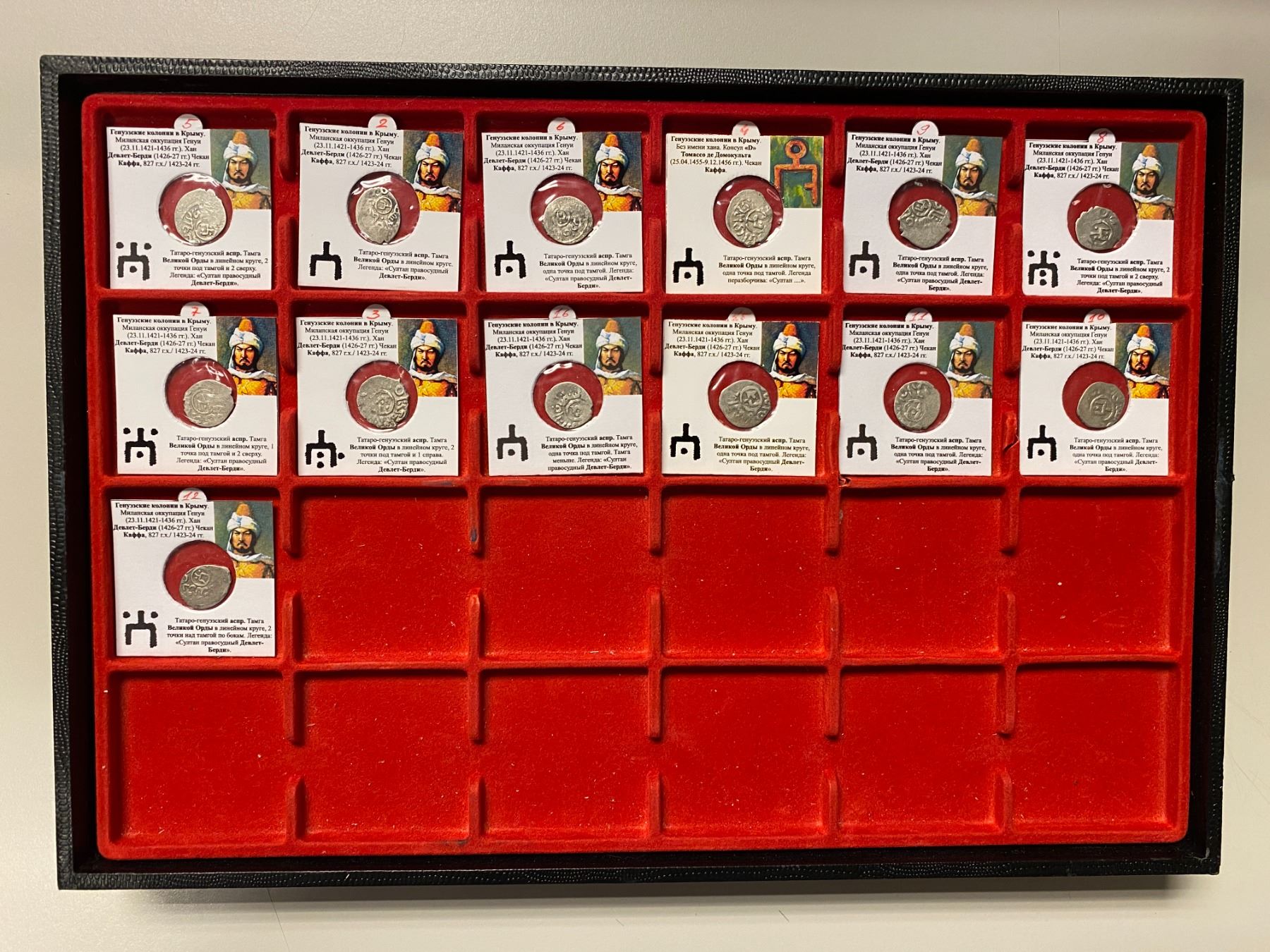 ITALY: CAFFA: LOT of 12 silver aspers, D M CAFE, Genoese castle in center // Arabic legend, various versions of the Golden Horde tamgha in the center, a couple showing part of the name of the Golden Horde Dawlat Birdi Khan (1424-1437); average F-VF, nearly all with some weakness; each in a holden with detailed information (in Russian); retail value $650, lot of 12 pieces.