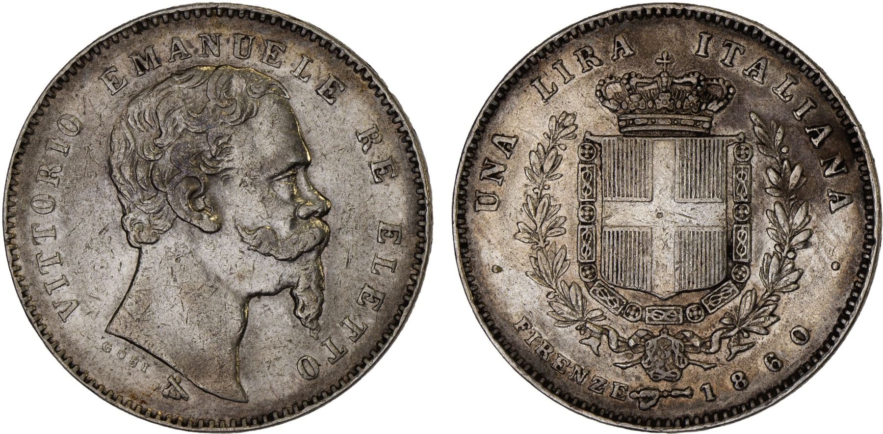 EMILIA: Vittorio Emanuele II, 1859-1861, AR lira, 1860, KM-9, variety with GORI and FIRENZE, lightly cleaned, two-year type, XF.