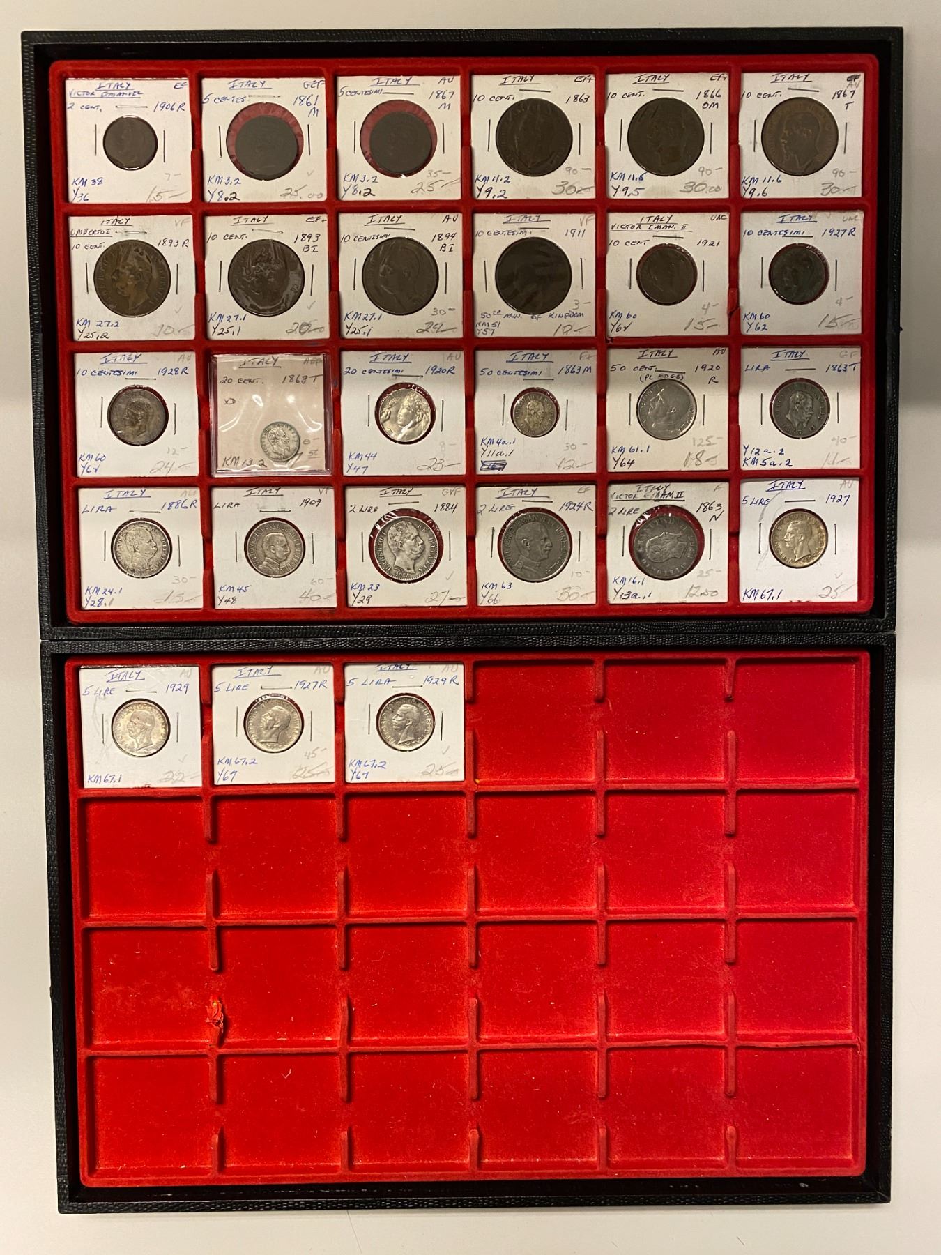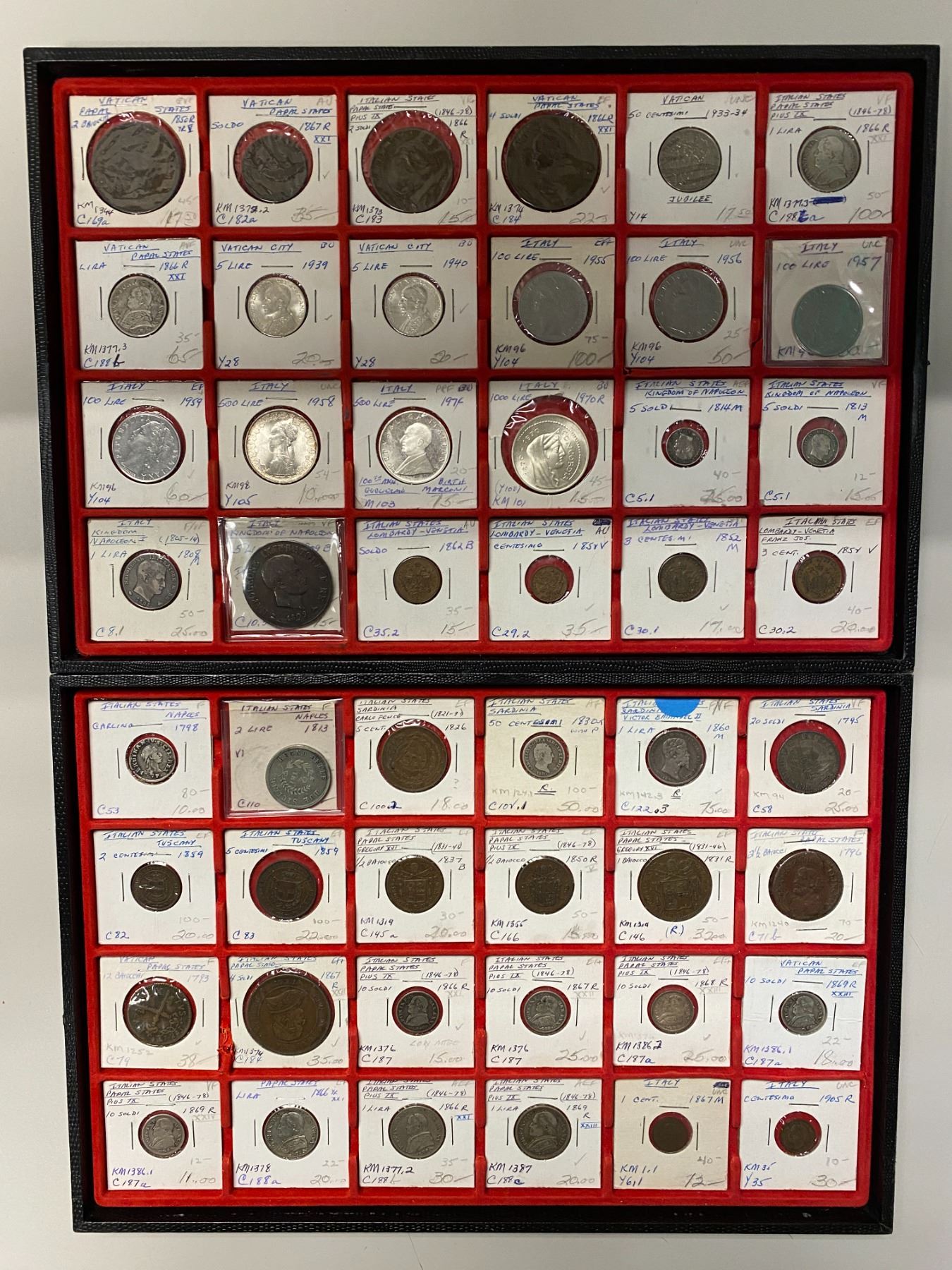 ITALY: LOT of 75 coins, including 16 coins of the Italian States - 9 silver including 4 from the Kingdom of Napoleon and an 1813 Naples 2 lire, 23 coins of the Vatican - 12 silver from 1793 to 1940, 29 of the Kingdom - 11 silver, with several higher grade items, and 7 others including 2-500 lire and 1 1-1,000 lire BU coins; retail value $1,000, lot of 75 pieces.