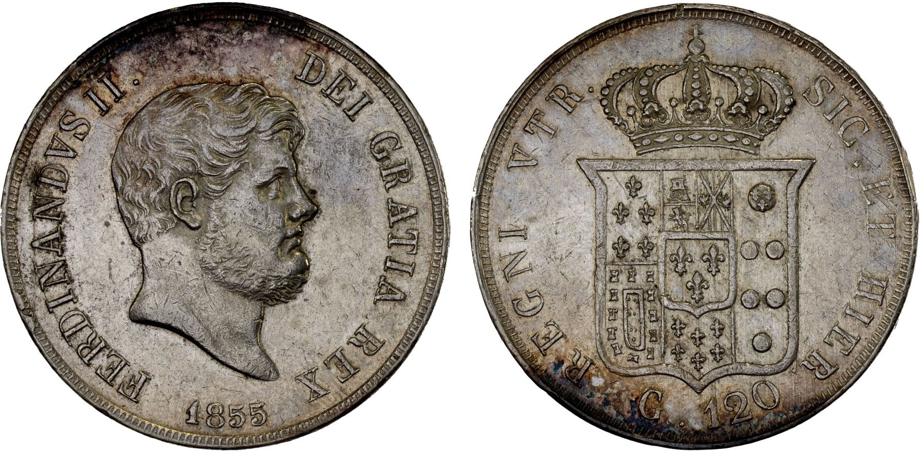 NAPLES: Ferdinando II, 1830-1859, AR 120 grana, 1855, KM-370, Dav-175. Cr-153c, F-503, Montenegro-801/803, small reverse rim bump, Choice XF.