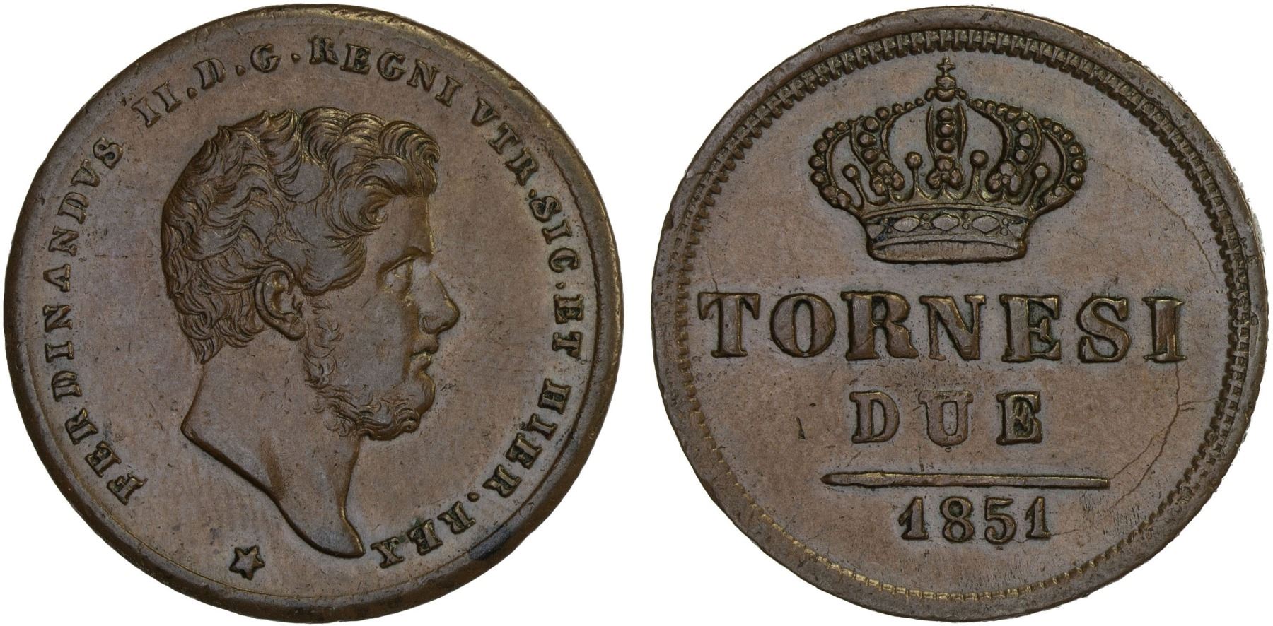 NAPLES & SICILY: Ferdinando II, 1830-1859, AE 2 tornesi, 1851, KM-327, glossy, XF.
